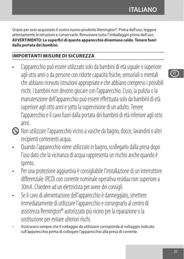 • Lorsque l’appareil est utilisé dans une salle de bains, débranchez-le après usage. La proximité de l’eau présente un danger même lorsque l’appareil est éteint. • Pour une protection supplémentaire, l’installation de courant résiduel (RCD) avec un differentiel residuel nominal ne dépassant pas 30mA est recommandée. Demandez de l’aide à un électricien. • Si le cordon d’alimentation de cet appareil est endommagé, cessez immédiatement d’utiliser l’appareil et renvoyez-le au service consommateurs Remington agréé le plus proche en vue de sa réparation ou de sa substitution afin d’éviter tout risque. • •