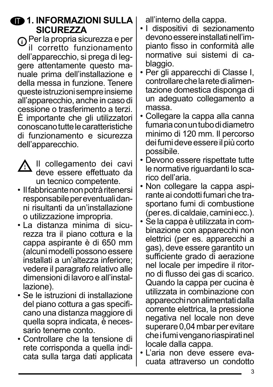 • Pour les appareils de Classe I, s’assurer que l’installation électrique de votre intérieur dispose d’une mise à la terre adéquate. Reliez l’aspirateur du conduit de cheminée avec un tube ayant un diamètre minimum de 120 mm. Le parcours des fumées doit être le plus court possible. Respecter toutes les normes concernant l’évacuation de l’air. Ne reliez pas la hotte aspirante aux conduits de cheminée qui acheminent les fumées de combustion (par ex. de chaudières, de cheminées, etc.). Si vous utilisez l’aspirateur en même temps que des appareils non électriques (par ex. fonctionnant au gaz), veillez à ce que la pièce soit adéquatement ventilée, afin d’empêcher le retour du flux des gaz d’évacuation. Si vous utilisez la hotte de cuisine en même temps que des appareils non alimentés à l’électricité, la pression négative dans la pièce ne doit pas dépasser 0,04 mbar, afin d’éviter que les fumées soient réaspirées dans la pièce où se trouve la hotte. Ne pas évacuer l’air à travers 15