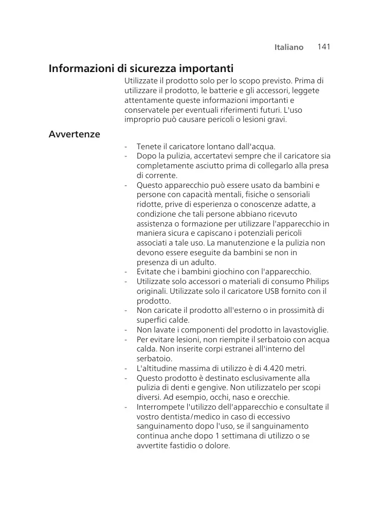 Cet appareil peut être utilisé par des enfants, des personnes dont les capacités physiques, sensorielles ou intellectuelles sont réduites ou des personnes manquant d'expérience et de connaissances, à condition que ces enfants ou personnes soient sous surveillance ou qu'ils aient reçu des instructions quant à l'utilisation sécurisée de l'appareil et qu'ils aient pris connaissance des dangers encourus. Le nettoyage et l'entretien ne doivent pas être effectués par des enfants sans surveillance. Les enfants ne doivent pas jouer avec l'appareil. Utilisez exclusivement des accessoires ou des consommables Philips d’origine. Utilisez uniquement le chargeur USB fourni avec le produit. Ne chargez pas le produit en extérieur ou à proximité de surfaces chauffantes. Ne nettoyez aucune pièce du produit au lave-vaisselle. Pour éviter les blessures physiques, ne remplissez pas le réservoir d'eau chaude. Ne mettez pas d'objets étrangers dans le réservoir. L'altitude d'utilisation maximale est de 4 420 mètres. Ce produit a été conçu uniquement pour le nettoyage des dents et des gencives. Ne l'utilisez jamais à d'autres fins. (par exemple, pour les yeux, le nez ou les oreilles).