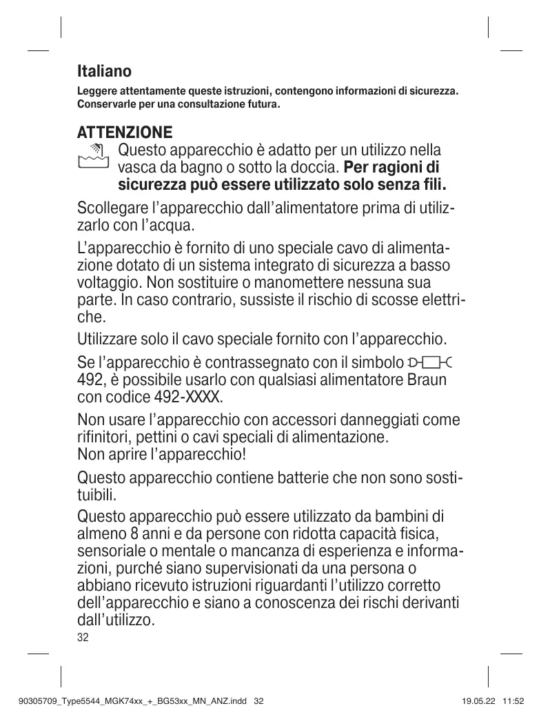 Italiano Leggere attentamente queste istruzioni, contengono informazioni di sicurezza. Conservarle per una consultazione futura. ATTENZIONE Questo apparecchio è adatto per un utilizzo nella vasca da bagno o sotto la doccia. Per ragioni di sicurezza può essere utilizzato solo senza fili. Scollegare l’apparecchio dall’alimentatore prima di utilizzarlo con l’acqua. L’apparecchio è fornito di uno speciale cavo di alimentazione dotato di un sistema integrato di sicurezza a basso voltaggio. Non sostituire o manomettere nessuna sua parte. In caso contrario, sussiste il rischio di scosse elettriche. Utilizzare solo il cavo speciale fornito con l’apparecchio. Se l’apparecchio è contrassegnato con il simbolo 492, è possibile usarlo con qualsiasi alimentatore Braun con codice 492-XXXX. Non usare l’apparecchio con accessori danneggiati come rifinitori, pettini o cavi speciali di alimentazione. Non aprire l’apparecchio! Questo apparecchio contiene batterie che non sono sostituibili. Questo apparecchio può essere utilizzato da bambini di almeno 8 anni e da persone con ridotta capacità fisica, sensoriale o mentale o mancanza di esperienza e informazioni, purché siano supervisionati da una persona o abbiano ricevuto istruzioni riguardanti l’utilizzo corretto dell’apparecchio e siano a conoscenza dei rischi derivanti dall’utilizzo.
