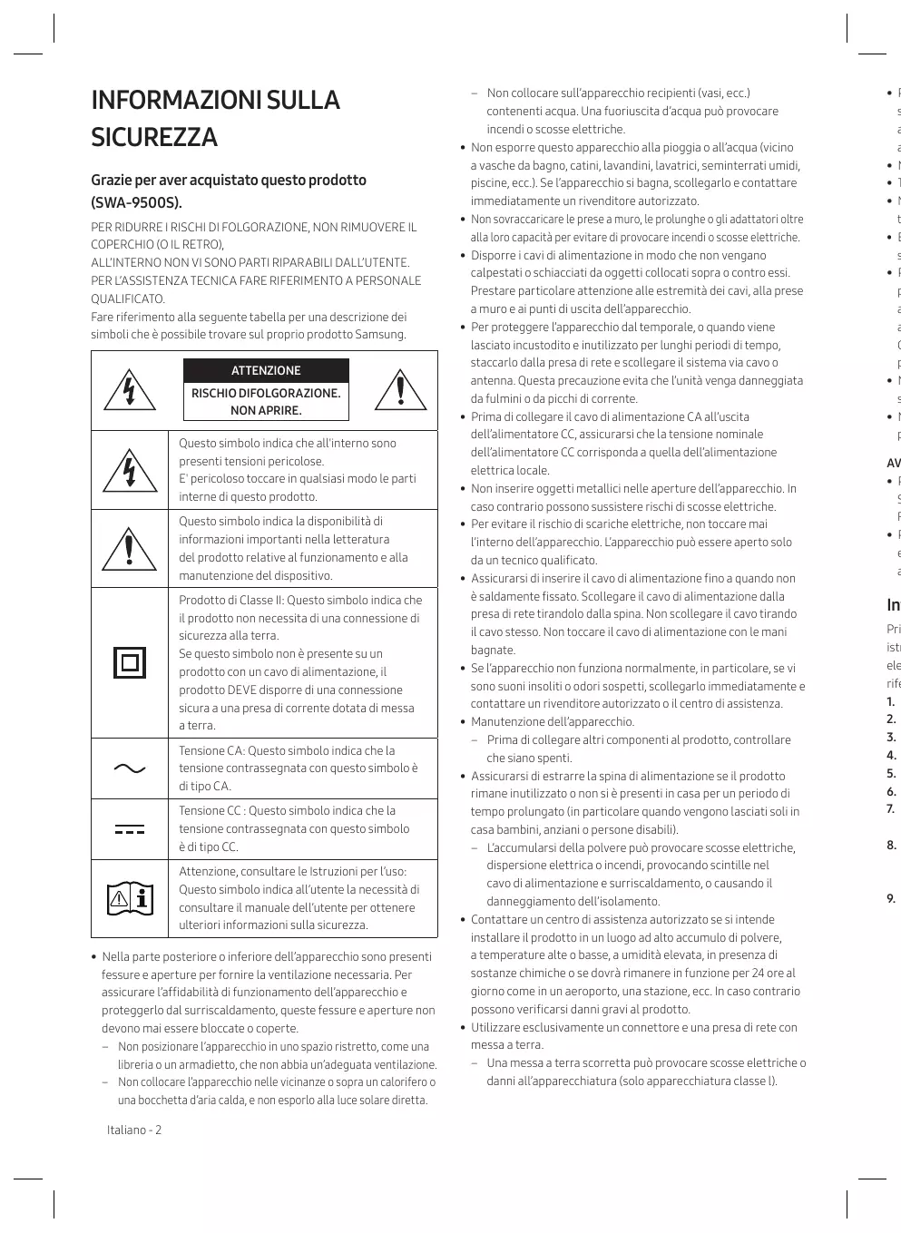 À PROPOS DU SERVICE INFORMAZIONI SULLA SICUREZZA Grazie per aver acquistato questo prodotto (SWA-9500S). PER RIDURRE I RISCHI DI FOLGORAZIONE, NON RIMUOVERE IL COPERCHIO (O IL RETRO), ALL’INTERNO NON VI SONO PARTI RIPARABILI DALL’UTENTE. PER L’ASSISTENZA TECNICA FARE RIFERIMENTO A PERSONALE QUALIFICATO. Fare riferimento alla seguente tabella per una descrizione dei simboli che è possibile trovare sul proprio prodotto Samsung.