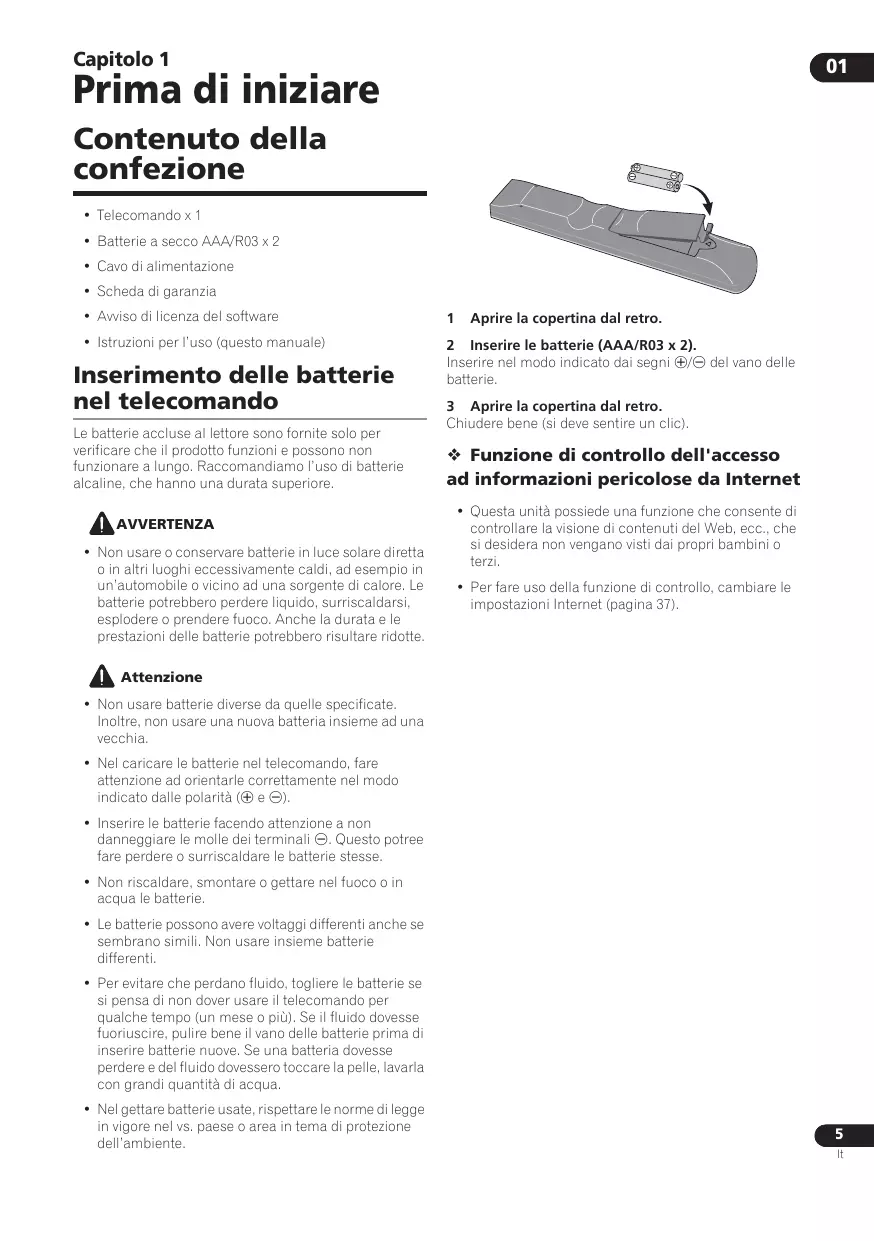 Inserimento delle batterie nel telecomando Le batterie accluse al lettore sono fornite solo per verificare che il prodotto funzioni e possono non funzionare a lungo. Raccomandiamo l’uso di batterie alcaline, che hanno una durata superiore. AVVERTENZA • Non usare o conservare batterie in luce solare diretta o in altri luoghi eccessivamente caldi, ad esempio in un’automobile o vicino ad una sorgente di calore. Le batterie potrebbero perdere liquido, surriscaldarsi, esplodere o prendere fuoco. Anche la durata e le prestazioni delle batterie potrebbero risultare ridotte.