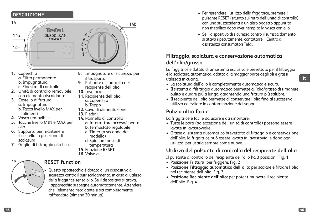 • • • • El nivel de aceite debe estar siempre entre los niveles MÍNIMO y MÁXIMO de la cubeta. Fig. 11 • No superes la línea de llenado máximo, ya que el aceite hirviendo puede rebosar durante el fritura y causar quemaduras graves.