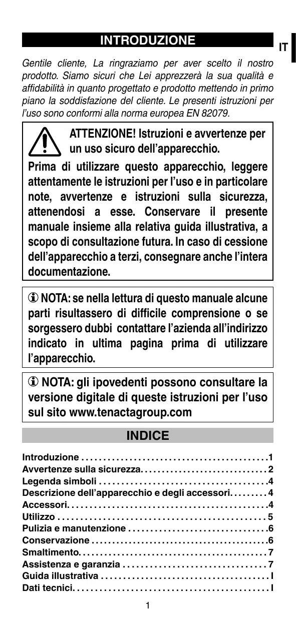 NOTA: se nella lettura di questo manuale alcune parti risultassero di difficile comprensione o se sorgessero dubbi contattare l’azienda all’indirizzo indicato in ultima pagina prima di utilizzare l’apparecchio. NOTA: gli ipovedenti possono consultare la versione digitale di queste istruzioni per l’uso sul sito www.tenactagroup.com INDICE Introduzione . . . . . . . . . . . . . . . . . . . . . . . . . . . . . . . . . . . . . . . . . . .1 Avvertenze sulla sicurezza. . . . . . . . . . . . . . . . . . . . . . . . . . . . . . 2 Legenda simboli . . . . . . . . . . . . . . . . . . . . . . . . . . . . . . . . . . . . . .4 Descrizione dell’apparecchio e degli accessori. . . . . . . . . 4 Accessori. . . . . . . . . . . . . . . . . . . . . . . . . . . . . . . . . . . . . . . . . . . . .4 Utilizzo . . . . . . . . . . . . . . . . . . . . . . . . . . . . . . . . . . . . . . . . . . . . . . 5 Pulizia e manutenzione . . . . . . . . . . . . . . . . . . . . . . . . . . . . . . . .6 Conservazione . . . . . . . . . . . . . . . . . . . . . . . . . . . . . . . . . . . . . . . . . . .6 Smaltimento. . . . . . . . . . . . . . . . . . . . . . . . . . . . . . . . . . . . . . . . . . . . 7 Assistenza e garanzia . . . . . . . . . . . . . . . . . . . . . . . . . . . . . . . . 7 Guida illustrativa . . . . . . . . . . . . . . . . . . . . . . . . . . . . . . . . . . . . . . I Dati tecnici. . . . . . . . . . . . . . . . . . . . . . . . . . . . . . . . . . . . . . . . . . . . I 1