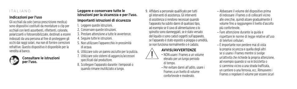 Une réparation est nécessaire lorsque l’appareil a été endommagé de quelque façon que ce soit (endommagement du cordon d’alimentation ou de la fiche électrique, renversement d’un liquide ou de tout objet sur l’appareil, exposition de l’appareil à la pluie ou à l’humidité, dysfonctionnement, chute de l’appareil, etc.). AVERTISSEMENTS/ PRÉCAUTIONS • Veillez à NE PAS utiliser les lunettes à un volume élevé pendant une période prolongée. ––Pour éviter des dommages auditifs, utilisez vos lunettes à un volume confortable, mais modéré.