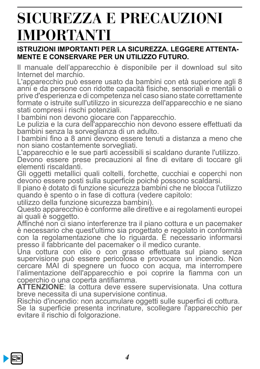 Il manuale dell’apparecchio è disponibile per il download sul sito Internet del marchio. L'apparecchio può essere usato da bambini con età superiore agli 8 anni e da persone con ridotte capacità fisiche, sensoriali e mentali o prive d'esperienza e di competenza nel caso siano state correttamente formate o istruite sull'utilizzo in sicurezza dell'apparecchio e ne siano stati compresi i rischi potenziali. I bambini non devono giocare con l'apparecchio. Le pulizia e la cura dell'apparecchio non devono essere effettuati da bambini senza la sorveglianza di un adulto. I bambini fino a 8 anni devono essere tenuti a distanza a meno che non siano costantemente sorvegliati. L'apparecchio e le sue parti accessibili si scaldano durante l'utilizzo. Devono essere prese precauzioni al fine di evitare di toccare gli elementi riscaldanti. Gli oggetti metallici quali coltelli, forchette, cucchiai e coperchi non devono essere posti sulla superficie poiché possono scaldarsi. Il piano è dotato di funzione sicurezza bambini che ne blocca l'utilizzo quando è spento o in fase di cottura (vedere capitolo: utilizzo della funzione sicurezza bambini). Questo apparecchio è conforme alle direttive e ai regolamenti europei ai quali è soggetto. Affinché non ci siano interferenze tra il piano cottura e un pacemaker è necessario che quest'ultimo sia progettato e regolato in conformità con la regolamentazione che lo riguarda. È necessario informarsi presso il fabbricante del pacemaker o il medico curante. Una cottura con olio o con grasso effettuata sul piano senza supervisione può essere pericolosa e provocare un incendio. Non cercare MAI di spegnere un fuoco con acqua, ma interrompere l’alimentazione dell'apparecchio e poi coprire la fiamma con un coperchio o una coperta antifiamma. ATTENZIONE: la cottura deve essere supervisionata. Una cottura breve necessita di una supervisione continua. Rischio d'incendio: non accumulare oggetti sulle superfici di cottura. Se la superficie presenta incrinature, scollegare l'apparecchio per evitare il rischio di folgorazione.