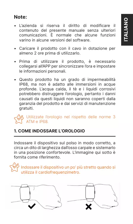 • L’azienda si riserva il diritto di modificare il contenuto del presente manuale senza ulteriori comunicazioni. È normale che alcune funzioni varino in alcune versioni del software. • Caricare il prodotto con il cavo in dotazione per almeno 2 ore prima di utilizzarlo. • Prima di utilizzare il prodotto, è necessario collegarsi all’APP per sincronizzare l’ora e impostare le informazioni personali. • Questo prodotto ha un grado di impermeabilità IP68, ma non è adatto alle immersioni in acque profonde. L’acqua calda, il tè e i liquidi corrosivi potrebbero distruggere l’orologio, pertanto i danni causati da questi liquidi non saranno coperti dalla garanzia del prodotto e dai servizi di manutenzione gratuiti. Utilizzate l’orologio nel rispetto delle norme 3 ATM e IP68.