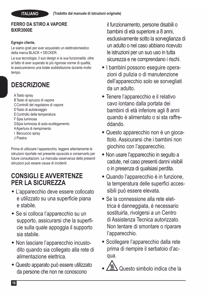 FERRO DA STIRO A VAPORE BXIR3000E Egregio cliente, Le siamo grati per aver acquistato un elettrodomestico della marca BLACK + DECKER. La sua tecnologia, il suo design e la sua funzionalità, oltre al fatto di aver superato le più rigorose norme di qualità, le assicureranno una totale soddisfazione durante molto tempo.