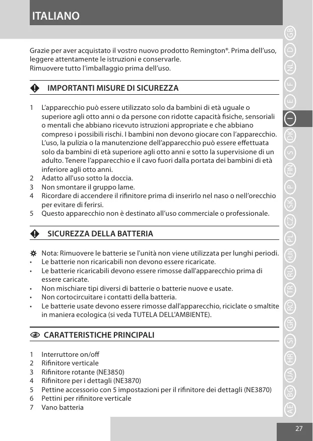 I E F IMPORTANTI MISURE DI SICUREZZA F Grazie per aver acquistato il vostro nuovo prodotto Remington®. Prima dell’uso, leggere attentamente le istruzioni e conservarle. Rimuovere tutto l’imballaggio prima dell’uso.