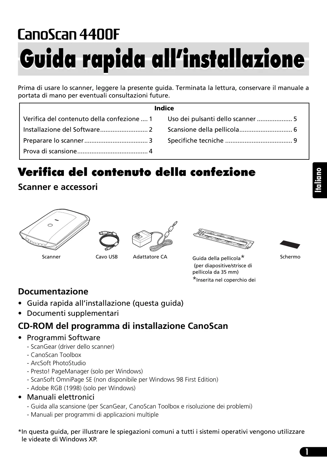 - Guida rapida all’installazione Prima di usare lo scanner, leggere la presente guida. Terminata la lettura, conservare il manuale a portata di mano per eventuali consultazioni future. Indice Verifica del contenuto della confezione p. 1