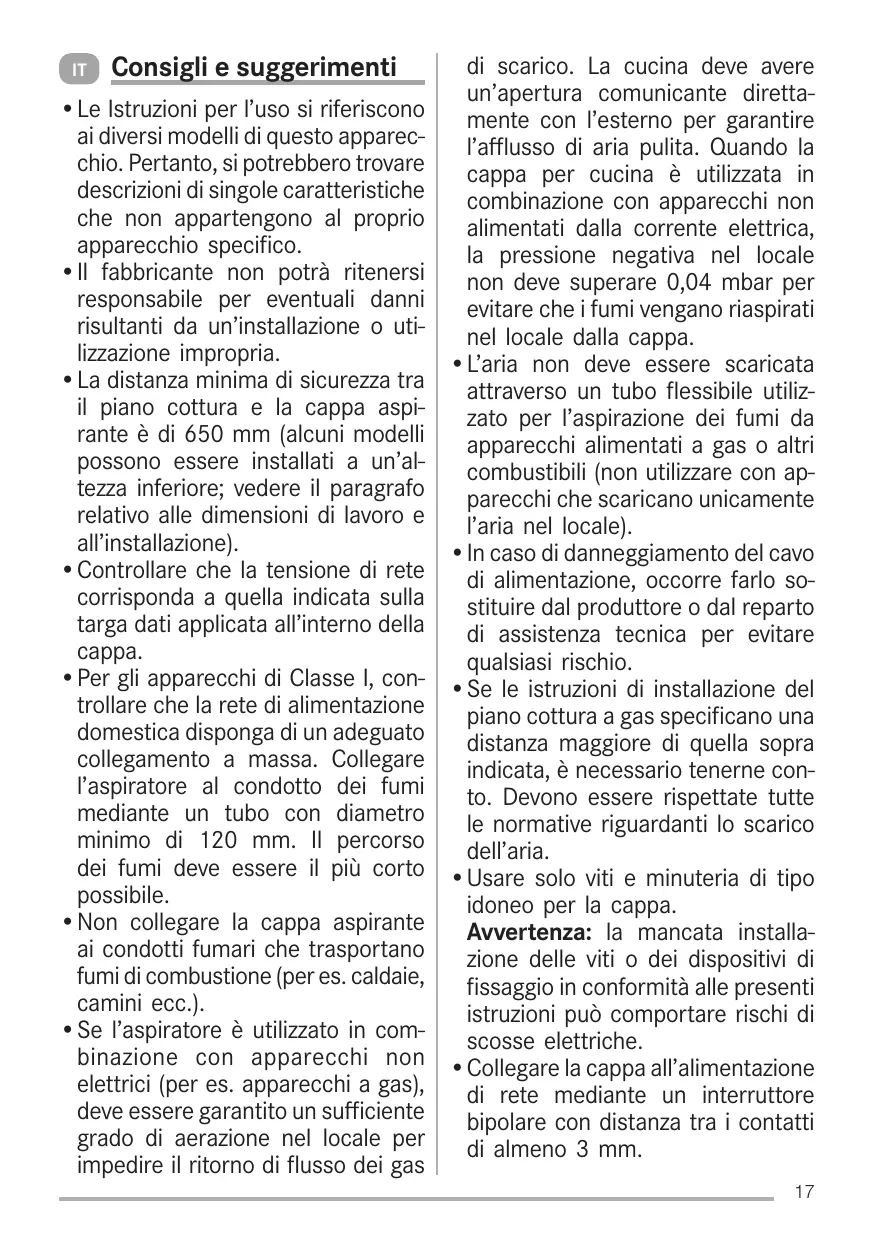 •Le Istruzioni per l’uso si riferiscono ai diversi modelli di questo apparecchio. Pertanto, si potrebbero trovare descrizioni di singole caratteristiche che non appartengono al proprio apparecchio specifico. •Il fabbricante non potrà ritenersi responsabile per eventuali danni risultanti da un’installazione o utilizzazione impropria. •La distanza minima di sicurezza tra il piano cottura e la cappa aspirante è di 650 mm (alcuni modelli possono essere installati a un’altezza inferiore; vedere il paragrafo relativo alle dimensioni di lavoro e all’installazione). •Controllare che la tensione di rete corrisponda a quella indicata sulla targa dati applicata all’interno della cappa. •Per gli apparecchi di Classe I, controllare che la rete di alimentazione domestica disponga di un adeguato collegamento a massa. Collegare l’aspiratore al condotto dei fumi mediante un tubo con diametro minimo di 120 mm. Il percorso dei fumi deve essere il più corto possibile. •Non collegare la cappa aspirante ai condotti fumari che trasportano fumi di combustione (per es. caldaie, camini ecc.). •Se l’aspiratore è utilizzato in combinazione con apparecchi non elettrici (per es. apparecchi a gas), deve essere garantito un sufficiente grado di aerazione nel locale per impedire il ritorno di flusso dei gas