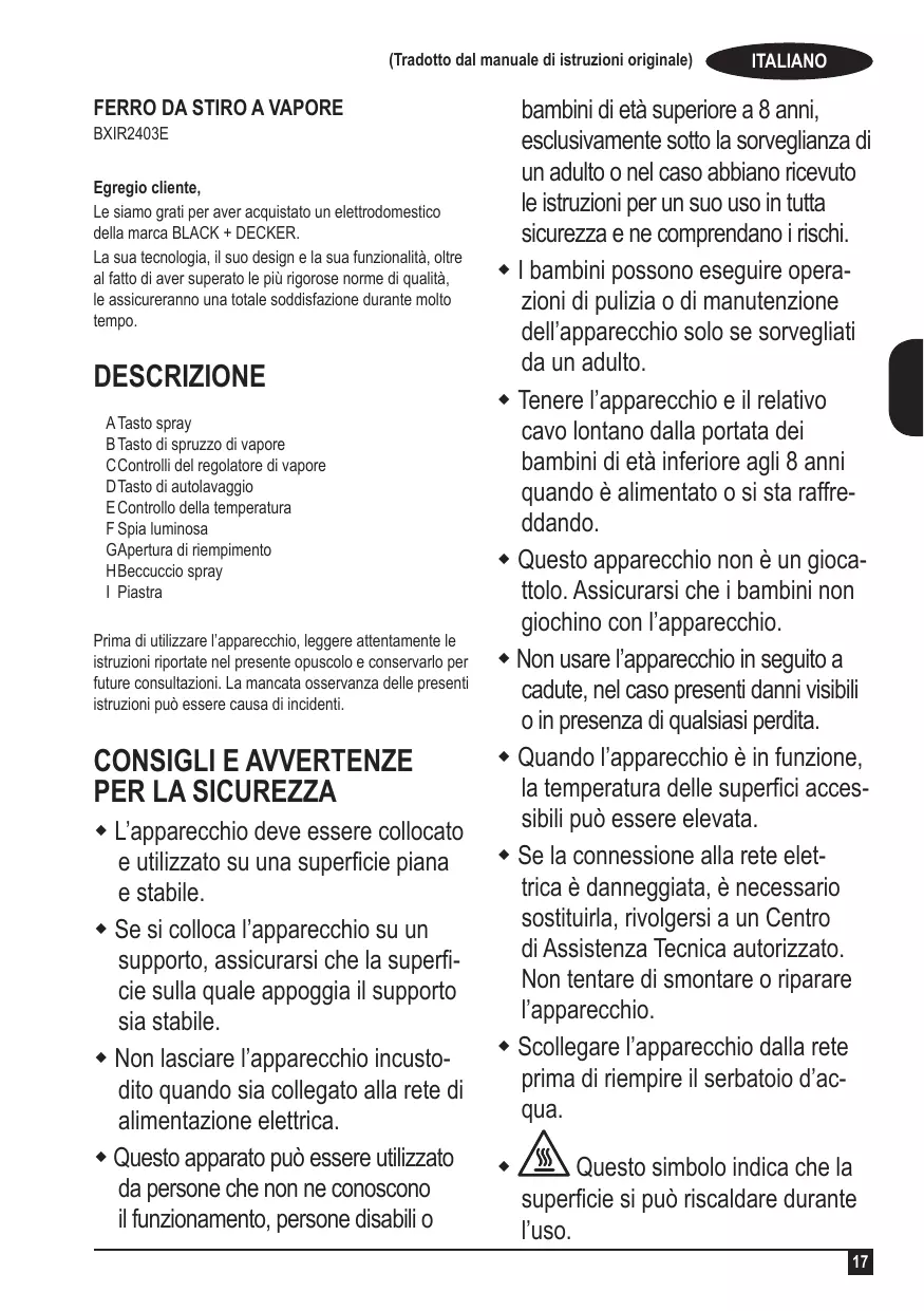 FERRO DA STIRO A VAPORE BXIR2403E Egregio cliente, Le siamo grati per aver acquistato un elettrodomestico della marca BLACK + DECKER. La sua tecnologia, il suo design e la sua funzionalità, oltre al fatto di aver superato le più rigorose norme di qualità, le assicureranno una totale soddisfazione durante molto tempo.