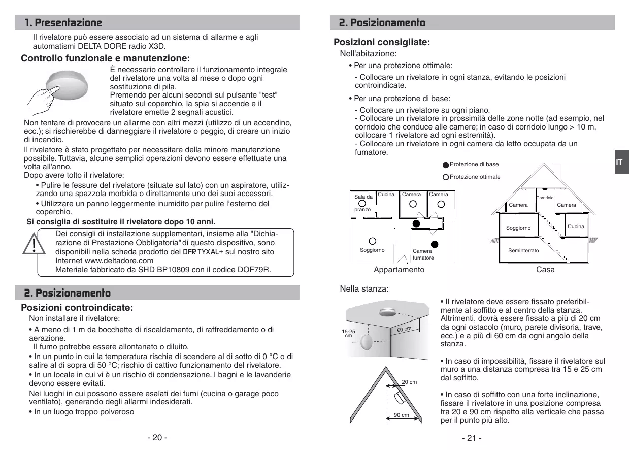 - Utilizzare un panno leggermente inumidito per pulire l’esterno del coperchio. Si consiglia di sostituire il rivelatore dopo 10 anni. Dei consigli di installazione supplementari, insieme alla "Dichiarazione di Prestazione Obbligatoria" di questo dispositivo, sono disponibili nella scheda prodotto del DFR TYXAL+ sul nostro sito Internet www.deltadore.com Materiale fabbricato da SHD BP10809 con il codice DOF79R. Posizioni consigliate: Nell'abitazione: