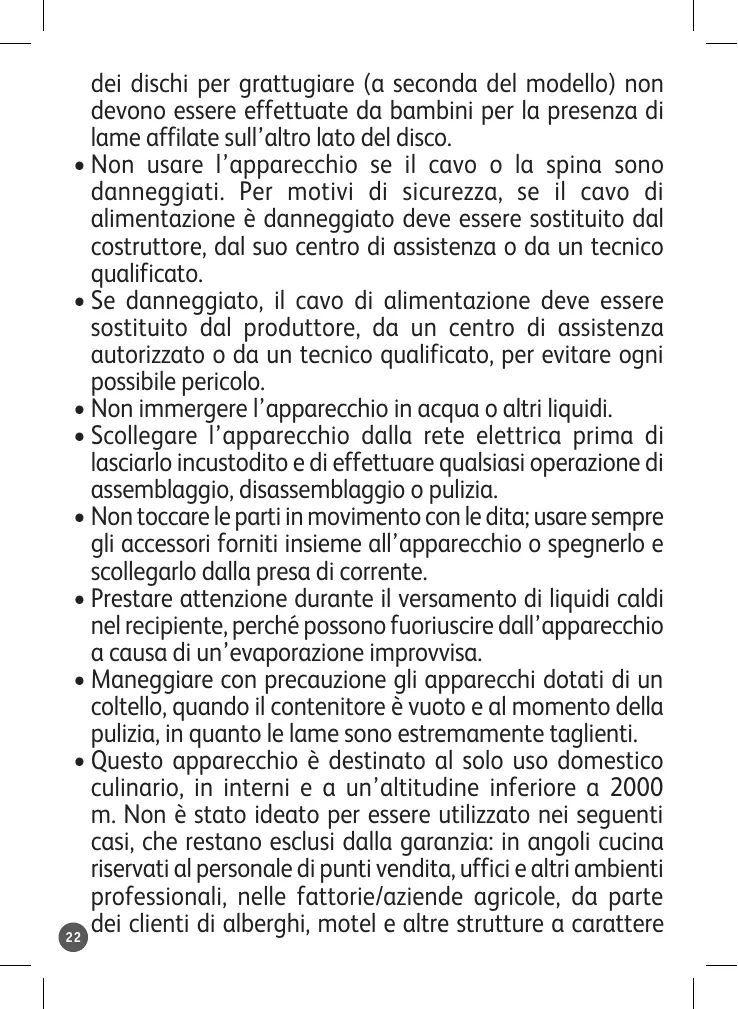N’utilisez pas l’appareil si la prise ou le câble d’alimentation est endommagé. Si le câble d’alimentation est endommagé, il doit être remplacé par le fabricant, son service après-vente ou une personne de qualification similaire afin d’éviter tout danger. • S i le câble d’alimentation est endommagé, il doit être remplacé par le fabricant, son Centre Service Agréé ou une personne de qualification similaire afin d’éviter tout danger. • L’appareil ne doit pas être immergé dans l’eau ou tout autre liquide. • Débranchez toujours l’appareil de la prise électrique avant de le laisser sans surveillance, de le nettoyer ou de l’assembler / démonter. • Ne touchez jamais les parties en mouvement avec vos doigts, utilisez toujours les accessoires fournis avec l’appareil ou éteignez-le puis débranchez-le. • Restez vigilant(e) si un liquide chaud est versé dans le robot ménager ou le mixeur dans la mesure où il peut être éjecté de l’appareil en raison d’une ébullition soudaine. • Pour les appareils possédant un couteau, manipulez-le avec précaution, lorsque le contenant est vidé et lors du nettoyage car les lames sont très coupantes. • Votre appareil est destiné uniquement à un usage domestique culinaire, à l’intérieur de la maison et à une 4