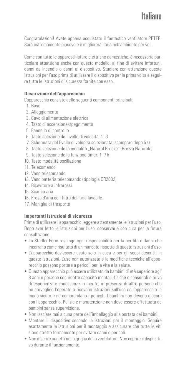 Niveau de bruit 33–52 dB(A) Conforme à la réglementation UE CE / DEEE / RoHS / EAC Sous réserve de modifications techniques Italiano Congratulazioni! Avete appena acquistato il fantastico ventilatore PETER. Sarà estremamente piacevole e migliorerà l’aria nell’ambiente per voi. Come con tutte le apparecchiature elettriche domestiche, è necessaria particolare attenzione anche con questo modello, al fine di evitare infortuni, danni da incendio o danni al dispositivo. Studiare con attenzione queste istruzioni per l’uso prima di utilizzare il dispositivo per la prima volta e seguire tutte le istruzioni di sicurezza fornite con esso. Descrizione dell’apparecchio L’apparecchio consiste delle seguenti componenti principali: