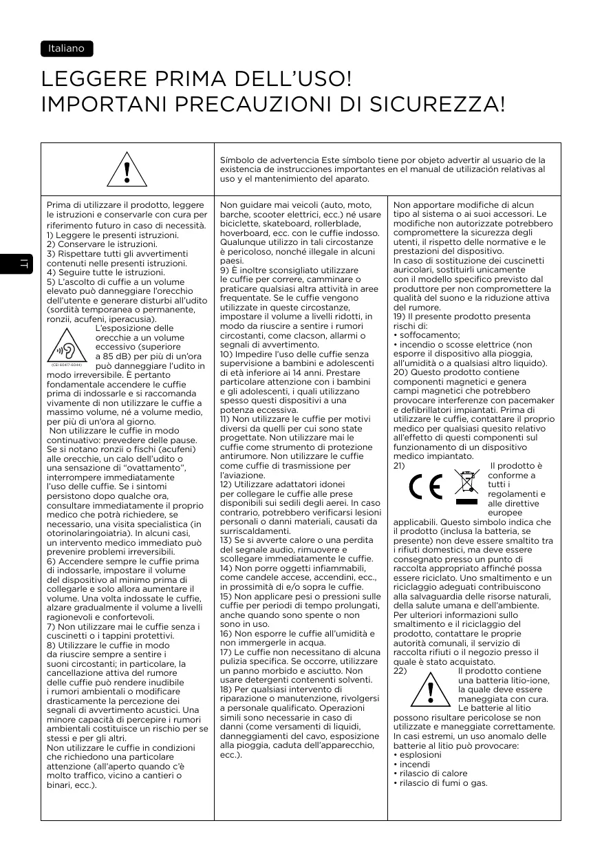 Avant toute utilisation du produit, lire les instructions et les conserver avec précaution pour vous y référer ultérieurement si nécessaire. 1) Lire ces instructions. 2) Conserver ces instructions. 3) Respecter tous les avertissements contenus dans ces instructions. 4) Suivre toutes les instructions. 5) L’écoute d’un casque à forte puissance peut endommager l’oreille de l’utilisateur et entraîner des troubles auditifs (surdité temporaire ou définitive, bourdonnements d’oreille, acouphènes, hyperacousie). L’exposition des oreilles à un volume excessif (supérieur à 85 dB) pendant plus d’une heure peut endommager l’ouïe irréversiblement. Il est donc impératif d’allumer le casque avant de le porter et il est vivement recommandé de ne pas utiliser le casque à plein volume, ni plus d’une heure par jour à volume moyen. Ne pas utiliser le casque de manière continue, faire des pauses. En cas d’apparition de bourdonnements ou de sifflements (acouphènes) dans les oreilles, de baisse d’audition ou de sensation de « coton », cesser immédiatement l’écoute du casque. Si les symptômes persistent au bout de quelques heures, consulter immédiatement votre médecin qui vous redirigera, si nécessaire, vers un spécialiste (ORL). Dans certains cas, un traitement immédiat peut éviter des troubles irréversibles. 6) Toujours allumer le casque avant de le porter, mettre le volume de l’appareil d’écoute au minimum avant d’y raccorder votre casque et d’augmenter le volume. Une fois le casque en place, augmenter progressivement le volume jusqu’à un niveau raisonnable et agréable. 7) Ne jamais utiliser le casque sans les coussinets ou embouts de protection. 8) Veiller à utiliser le casque de manière à pouvoir toujours entendre les sons environnants, en particulier, l’annulation active du bruit du produit peut rendre le bruit ambiant inaudible ou modifier radicalement la perception des signaux d’avertissement acoustiques ; la réduction de la possibilité d’entendre les bruits ambiants constitue un risque pour vous-même et votre entourage. Ne pas utiliser le casque dans des conditions nécessitant une attention particulière (à l’extérieur en cas de circulation importante, à proximité d’un chantier de construction ou d’une voie ferrée, etc.). (CEI 60417-6044)