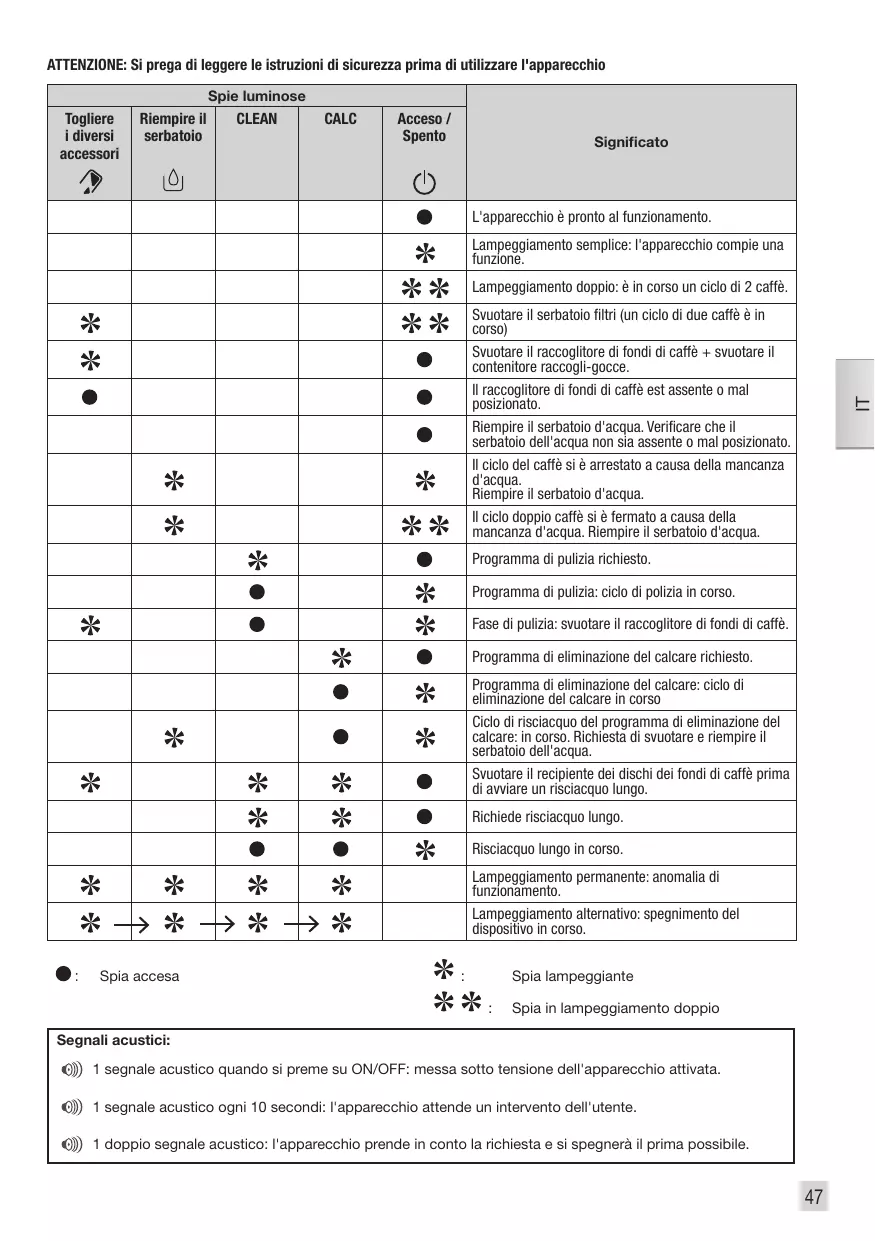Vider le collecteur de marc (un cycle de 2 cafés est en cours). Vider le collecteur de marc + vider le bac récoltegouttes. Le collecteur de marc est absent ou mal positionné. Remplir le réservoir d'eau. Le réservoir d'eau est absent ou mal positionné. Le cycle café a été interrompu par manque d'eau. Remplir le réservoir d'eau. Le cycle double café a été interrompu par manque d'eau. Remplir le réservoir. Programme de nettoyage demandé. Programme de nettoyage : cycle de nettoyage en cours. Phase de nettoyage : vider le bac à marc. Programme de détartrage demandé. Programme de détartrage : cycle de détartrage en cours. Cycles de rinçage du programme de détartrage : en cours. Demande de vider et de remplir le réservoir d'eau. Vider le bac à cake avant le lancement d'un rinçage long. Demande rinçage long. Rinçage long en cours. Clignotement Simultané : anomalie de fonctionnement. Clignotement voyant après voyant : mise en hors tension de l'appareil en cours. :