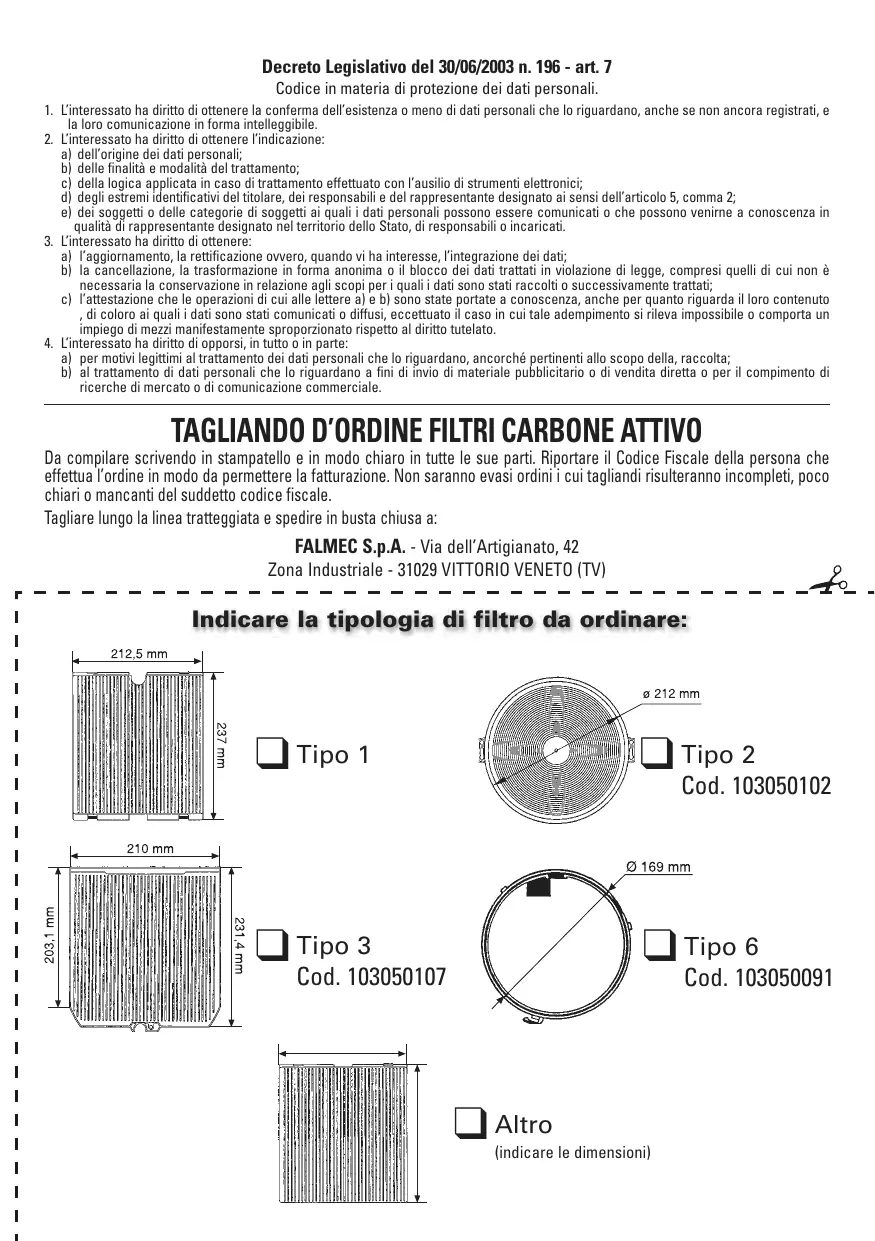 Spettabile ditta FALMEC S.p.A. vi prego di inviarmi numero _________ filtri carbone come ricambio per la cappa che ho in casa al prezzo di € 7 (sette) cadauno IVA compresa più spese di spedizione. Pagherò in contrassegno al postino al momento della consegna la somma totale di € _________. Vi prego spedire a: