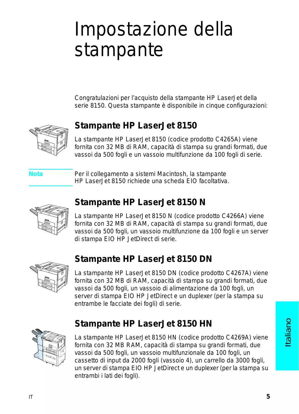 Impostazione della stampante Congratulazioni per l’acquisto della stampante HP LaserJet della serie 8150. Questa stampante è disponibile in cinque configurazioni: Stampante HP LaserJet 8150 La stampante HP LaserJet 8150 (codice prodotto C4265A) viene fornita con 32 MB di RAM, capacità di stampa su grandi formati, due vassoi da 500 fogli e un vassoio multifunzione da 100 fogli di serie. Nota Per il collegamento a sistemi Macintosh, la stampante HP LaserJet 8150 richiede una scheda EIO facoltativa. Stampante HP LaserJet 8150 N La stampante HP LaserJet 8150 N (codice prodotto C4266A) viene fornita con 32 MB di RAM, capacità di stampa su grandi formati, due vassoi da 500 fogli, un vassoio multifunzione da 100 fogli e un server di stampa EIO HP JetDirect di serie. Stampante HP LaserJet 8150 DN Stampante HP LaserJet 8150 HN La stampante HP LaserJet 8150 HN (codice prodotto C4269A) viene fornita con 32 MB RAM, capacità di stampa su grandi formati, due vassoi da 500 fogli, un vassoio multifunzionale da 100 fogli, un cassetto di input da 2000 fogli (vassoio 4), un carrello da 3000 fogli, un server di stampa EIO HP JetDirect e un duplexer (per la stampa su entrambi i lati dei fogli).