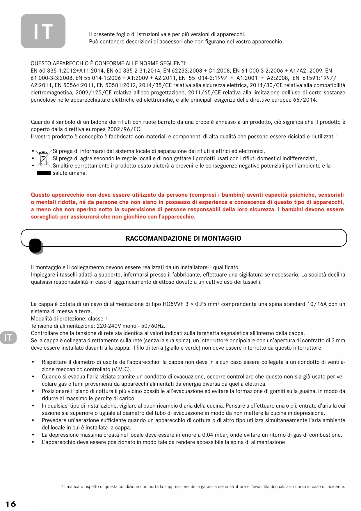 QUESTO APPARECCHIO È CONFORME ALLE NORME SEGUENTI: EN 60 335-1:2012+A11:2014, EN 60 335-2-31:2014, EN 62233:2008 + C1:2008, EN 61 000-3-2:2006 + A1/A2: 2009, EN 61 000-3-3:2008, EN 55 014-1:2006 + A1:2009 + A2:2011, EN 55 014-2:1997 + A1:2001 + A2:2008, EN 61591:1997/ A2:2011, EN 50564:2011, EN 50581:2012, 2014/35/CE relativa alla sicurezza elettrica, 2014/30/CE relativa alla compatibilità elettromagnetica, 2009/125/CE relativa all’eco-progettazione, 2011/65/CE relativa alla limitazione dell’uso di certe sostanze pericolose nelle apparecchiature elettriche ed elettroniche, e alle principali esigenze delle direttive europee 66/2014. Quando il simbolo di un bidone dei rifiuti con ruote barrato da una croce è annesso a un prodotto, ciò significa che il prodotto è coperto dalla direttiva europea 2002/96/EC. Il vostro prodotto è concepito è fabbricato con materiali e componenti di alta qualità che possono essere riciclati e riutilizzati : • • •