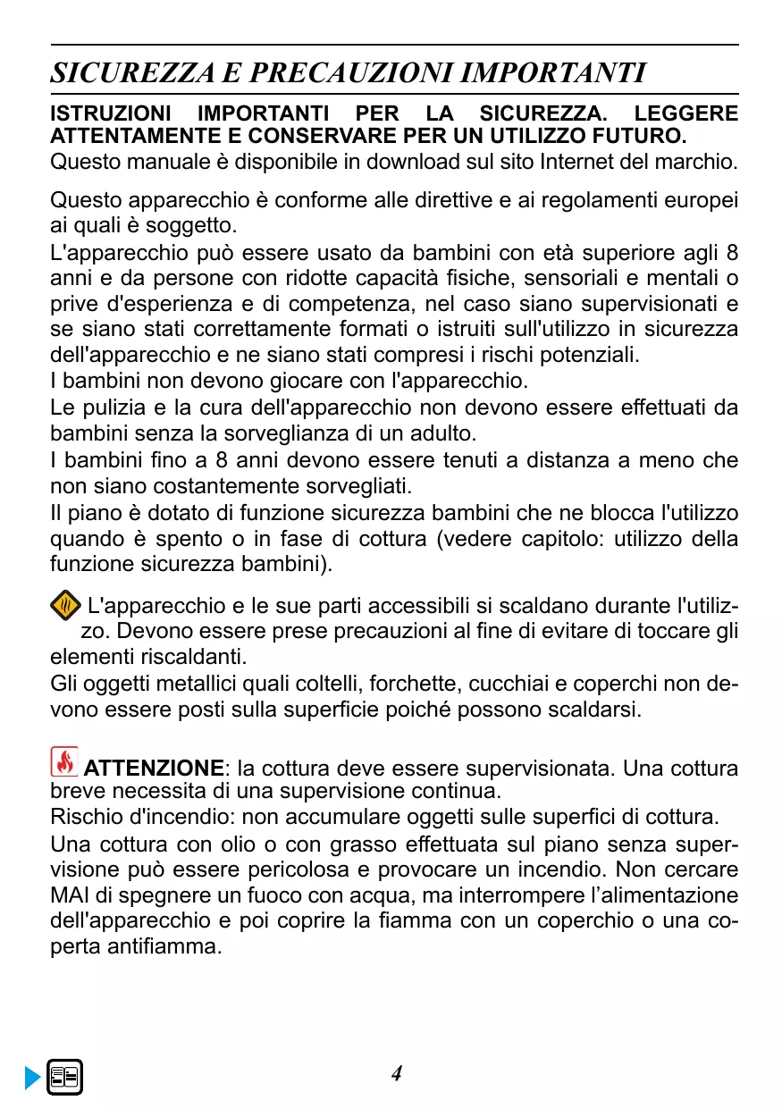 Choix du récipient14 Sélection de foyer13 Mise en Marche - Arrêt15 Réglage de la puissance15 Horizone (selon modèle)16 Réglage de la minuterie16 Verrouillage des commandes17 Fonction SWITCH 17 Fonction ICS17 Fonction RECALL 17 Votre appareil est conforme aux directives et réglementations européennes auxquelles il est soumis. Cet appareil peut être utilisé par des enfants âgés de 8 ans et plus et par des personnes ayant des capacités physiques, sensorielles ou mentales réduites ou des personnes sans expérience et connaissance, si elles sont correctement surveillées ou si elles ont été correctement informées ou formées à l’utilisation de l’appareil en toute sécurité et qu’elles en comprennent les risques qui en résultent. Les enfants ne doivent pas jouer avec l’appareil. Le nettoyage et l’entretien par l’usager ne doivent pas être effectués par des enfants sans surveillance. Les enfants de moins de 8 ans doivent être tenus à l’écart à moins qu’ils ne soient surveillés en permanence. Votre table possède une sécurité enfant qui verrouille son utilisation à l’arrêt ou en cours de cuisson (voir chapitre: utilisation de la sécurité enfant). L’appareil et ses parties accessibles deviennent chauds pendant l’utilisation. Des précautions doivent être prises pour éviter de toucher les éléments chauffants. Les objets métalliques tels que couteaux, fourchettes, cuillères et couvercles ne doivent pas être placés sur la surface, car ils peuvent devenir chauds. ATTENTION : la cuisson doit être surveillée. Une cuisson courte nécessite une surveillance continue. Risque d’incendie : ne pas stocker d’objets sur les zones de cuisson. Une cuisson avec de l’huile ou de la matière grasse effectuée sur une table, et sans surveillance peut être dangereuse et donner lieu à un incendie. Ne tentez JAMAIS d’éteindre un feu avec de l’eau, mais coupez l’alimentation de l’appareil avant de couvrir la flamme avec par exemple un couvercle ou une couverture anti feu. 4