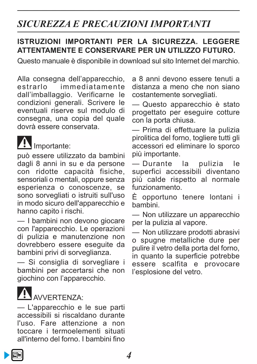 Importante: può essere utilizzato da bambini dagli 8 anni in su e da persone con ridotte capacità fisiche, sensoriali o mentali, oppure senza esperienza o conoscenze, se sono sorvegliati o istruiti sull'uso in modo sicuro dell'apparecchio e hanno capito i rischi. — I bambini non devono giocare con l'apparecchio. Le operazioni di pulizia e manutenzione non dovrebbero essere eseguite da bambini privi di sorveglianza. — Si consiglia di sorvegliare i bambini per accertarsi che non giochino con l’apparecchio. AVVERTENZA: — L'apparecchio e le sue parti accessibili si riscaldano durante l'uso. Fare attenzione a non toccare i termoelementi situati all'interno del forno. I bambini fino