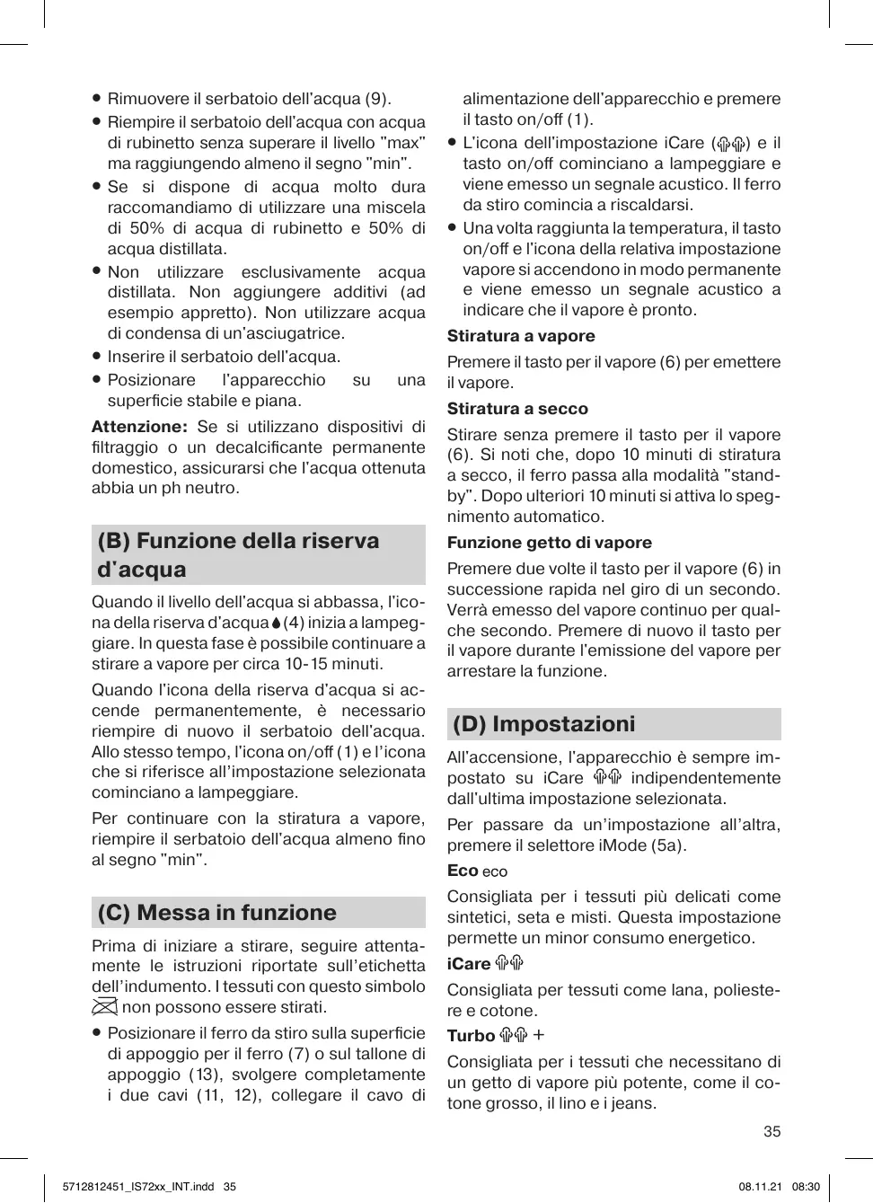 Lorsque l’appareil est mis en marche, il est toujours réglé selon le réglage iCare , indépendamment du dernier réglage choisi. Pour passer d’un réglage à un autre, appuyez sur le bouton sélecteur iMode (5a). Eco Ce réglage est recommandé pour les tissus les plus délicats tels que les tissus synthétiques, la soie ou les tissus métissés. Ce réglage permet de réduire la consommation d’énergie.