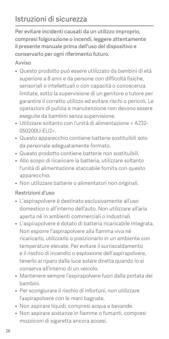 • Ce produit peut être utilisé par des enfants à partir de 8 ans, ainsi que des personnes présentant des déficiences physiques, sensorielles ou intellectuelles, ou dont l’expérience et les connaissances sont limitées sous le contrôle d’un parent ou d’un tuteur pour assurer une utilisation sécurisée et éviter tout danger. Le nettoyage et l’entretien ne doivent pas être effectués par des enfants sans surveillance. • N’utilisez que l’unité d’approvisionnement <A232050200U-EU2>. • Cet appareil contient des batteries ne pouvant être remplacées que par des personnes compétentes. • Ce produit contient des piles non remplaçables. • Pour charger la batterie, utilisez uniquement l'unité d'approvisionnement amovible fournie avec cet appareil. • N’utilisez pas de batterie, d’adaptateur d’alimentation ou de socle de charge tiers. Restrictions d’utilisation • L’aspirateur est destiné uniquement à être utilisé à domicile et dans un véhicule. Ne l’utilisez pas à l’extérieur, sous la pluie ni dans des environnements industriels. • L’aspirateur contient une batterie intégrée rechargeable. N’exposez pas l’aspirateur au feu et ne le chargez pas, ne l’utilisez pas ou ne l’entreposez pas dans un environnement à température élevée. Afin d’empêcher une surchauffe et un risque d'incendie ou d explosion, placez l’aspirateur à l’abri du soleil lorsqu'il est stocké dans un véhicule. • Gardez toujours l’aspirateur hors de la portée des enfants. • Afin d’éviter le risque de blessure, n’utilisez pas l’aspirateur avec les mains mouillées. 39