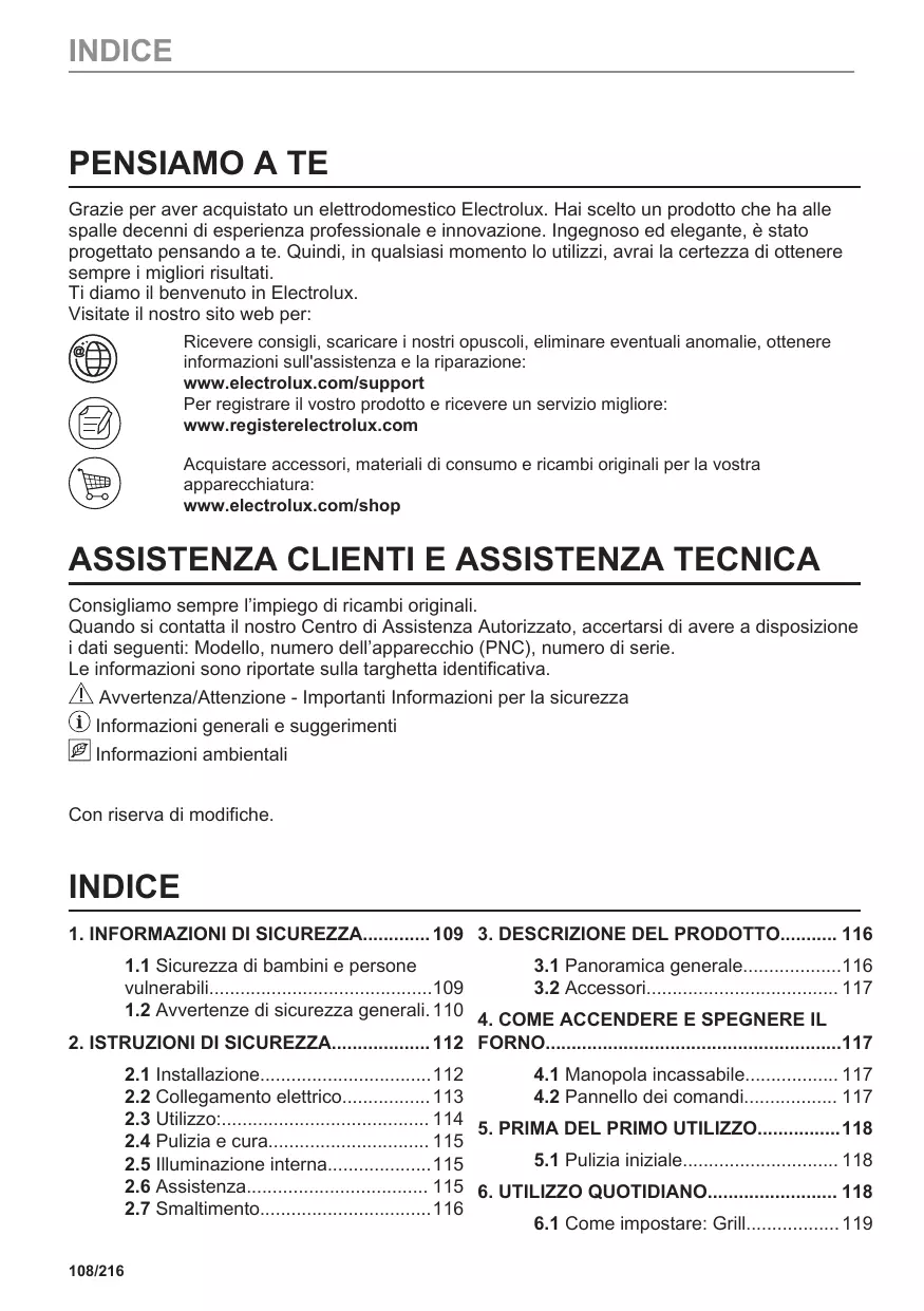 Grazie per aver acquistato un elettrodomestico Electrolux. Hai scelto un prodotto che ha alle spalle decenni di esperienza professionale e innovazione. Ingegnoso ed elegante, è stato progettato pensando a te. Quindi, in qualsiasi momento lo utilizzi, avrai la certezza di ottenere sempre i migliori risultati. Ti diamo il benvenuto in Electrolux. Visitate il nostro sito web per: Ricevere consigli, scaricare i nostri opuscoli, eliminare eventuali anomalie, ottenere informazioni sull'assistenza e la riparazione: www.electrolux.com/support Per registrare il vostro prodotto e ricevere un servizio migliore: www.registerelectrolux.com Acquistare accessori, materiali di consumo e ricambi originali per la vostra apparecchiatura: www.electrolux.com/shop