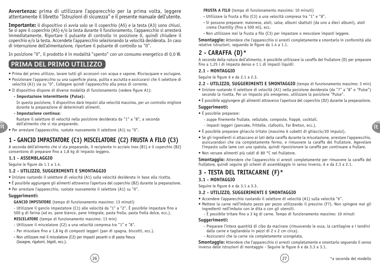 • Démarrez en tournant le bouton variateur (A1) sur la position désirée selon la recette. • Vous pouvez ajouter des aliments par l’orifice du couvercle (B2) au cours de la préparation. • Pour arrêter l’appareil, ramener le bouton (A1) sur « 0 ».