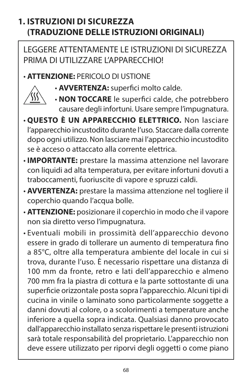 • AVERTISSEMENT : ôter le couvercle avec précaution lorsque l’eau est en ébullition. • ATTENTION : positionner le couvercle de façon à dévier la vapeur de la poignée. • Toute pièce de mobilier adjacente doit pouvoir résister à une augmentation de température d’au moins 85 °C au-dessus de la température ambiante de la pièce où se trouve l’appareil durant son utilisation. L’espace autour de l’appareil doit être dégagé de 100 mm à l’avant, à l’arrière et sur les côtés de l’appareil et de 700 mm entre la plaque de cuisson et le côté inférieur de toute surface horizontale située au-dessus de l’appareil. Certains meubles de cuisine en vinyle ou en stratifié sont particulièrement sensibles aux dommages dus à la chaleur ou aux décolorations dues à des températures élevées, même inférieures aux directives susmentionnées. Tout dommage découlant d’une installation de l’appareil 1