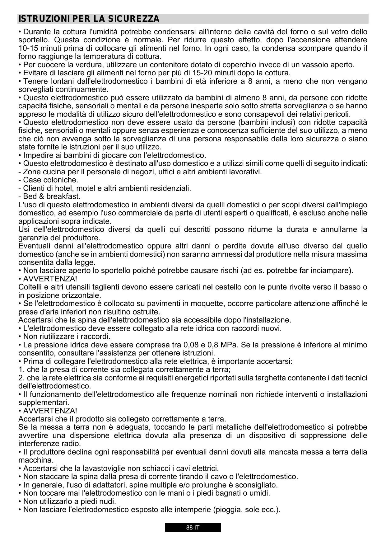 Geschirrs und der Art des Waschgangs. Normalerweise wird eine Dosis von 15 g empfohlen. Wenn das Wasser hart ist oder das Geschirr außergewöhnlich schmutzig ist, sollten 25 g Reinigungsmittel eingefüllt werden. Nachdem Sie das Reinigungsmittel in den Spender gegeben haben, schließen Sie den Deckel, da nicht alle Reinigungsmittel gleich sind und die Anweisungen auf den Reinigungsmittelpackungen variieren können. C’est tout à fait normal. Pour réduire cet effet, attendre 10 à 15 minutes après avoir allumé le four avant d’y placer des aliments à l’intérieur. Dans tous les cas, la condensation disparaît lorsque le four atteint la température de cuisson. • Cuire les légumes dans un récipient muni d’un couvercle plutôt que sur une plaque ouverte. • Éviter de laisser des aliments à l’intérieur du four pendant plus de 15 à 20 minutes après la cuisson. • Les enfants de moins de 8 ans doivent rester à l'écart de l'appareil, à moins d'être constamment surveillés. • Cet appareil peut être utilisé par les enfants de plus de 8 ans et les personnes ayant des capacités physiques, sensorielles ou mentales réduites ou un manque d’expérience et de connaissances, s’ils ont été supervisés ou si on leur a appris à utiliser l’appareil en toute sécurité et qu’ils comprennent les risques courus. • Cet appareil n’est pas prévu pour être utilisé par des personnes (y compris des enfants) à capacités physiques, sensorielles ou intellectuelles réduites ou sans expérience et connaissances, à moins d’être surveillés ou d’avoir appris à utiliser l’appareil par une personne responsable de leur sécurité • Les enfants ne doivent pas jouer avec l'appareil. • Cet appareil est conçu pour être utilisé dans une habitation et pour des applications similaires telles que : - coins-cuisine du personnel dans des magasins, bureaux et autres environnements de travail ; - habitations rurales ; - des clients dans des hôtels, motels et autres environnements de type résidentiel ; - environnements de type chambres d’hôtes ou B&B. Une utilisation de cet appareil en dehors de l'environnement domestique ou des fonctions typiques d'entretien ménager, comme l'utilisation commerciale par des experts ou des utilisateurs formés, est exclue même dans les applications ci-dessus. Si l'appareil est utilisé d'une manière incompatible avec ces applications, la durée de vie de l'appareil peut être réduite et la garantie du fabricant annulée. Tout dommage à l'appareil ou tout autre dommage ou perte résultant d'une utilisation qui n'est pas conforme à un usage domestique ou ménager (même s'il est situé dans un environnement domestique ou ménager) ne doit pas être accepté par le fabricant dans les limites autorisées par la loi. • Ne jamais laisser la porte en position ouverte pour éviter tout risque potentiel (par ex. trébuchage). • AVERTISSEMENT ! Placer les couteaux et les autres ustensiles de cuisine pointus avec la pointe vers le bas ou à l’horizontale. • Si l’appareil est posé sur un sol recouvert de moquette, faites attention à ce que les bouches d’aération au bas de l’appareil ne soient pas obstruées. Vérifier si la fiche de l’appareil reste accessible après l’installation. • L’appareil doit être raccordé sur le circuit de distribution de l’eau à l’aide d’un tuyau flexible neuf. • Ne pas réutiliser les vieux tuyaux flexibles. • La pression de l’eau doit être comprise entre 0,08 Mpa et 0,8 Mpa. Si la pression est inférieure à la valeur minimum, s'adresser à notre service après-vente. • Avant de brancher l’appareil sur le secteur, vérifier si : 1. la prise d’alimentation est correctement mise à la terre ; 2. si le secteur est en mesure de prendre en charge la consommation indiquée sur la plaque signalétique de votre appareil. • Aucun réglage/opération supplémentaire n’est requis pour faire fonctionner l’appareil aux fréquences nominales. • AVERTISSEMENT ! Vérifier si l'appareil est correctement mis à la terre. Si l'appareil n’est pas correctement mis à la terre, en touchant une partie métallique du lave-vaisselle, la dispersion électrique provoquée par la présence d’un filtre antiparasite est ressentie. • Le fabricant décline toute responsabilité en cas de dommage dû à une machine non mise à la terre. • S'assurer que le lave-vaisselle n'écrase pas les câbles d'alimentation. • Ne pas retirer la fiche de la prise secteur en tirant le câble d'alimentation ou la machine elle-même. • De manière générale, il n'est pas recommandé d'utiliser des adaptateurs, des multiprises et/ou des rallonges. • Ne jamais toucher l'appareil avec les mains ou les pieds mouillés ou humides. • Ne pas utiliser l'appareil pieds nus. • Ne pas laisser l'appareil exposé aux éléments (pluie, soleil, etc.). • Le fait de se pencher ou de s'asseoir sur la porte ouverte du lave-vaisselle pourrait le faire basculer. • Si l'appareil tombe en panne ou cesse de fonctionner correctement, l'éteindre, couper l'alimentation en eau et ne rien faire de plus. Les travaux de réparation ne doivent être effectués que par un technicien agréé et seules les pièces détachées authentiques doivent être installées. Tout non-respect des conseils cidessus peut avoir de graves conséquences sur la sécurité de l'appareil.
