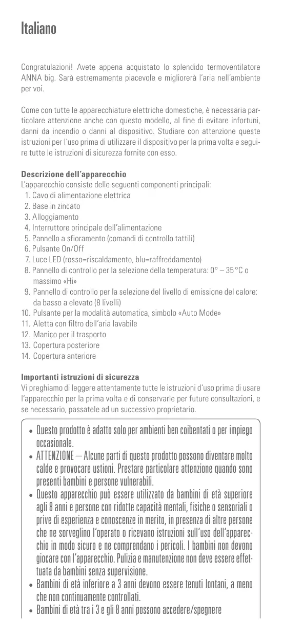 L’appareil est composé des éléments principaux suivants : 1. Cordon électrique pour l’alimentation 2. Base en zinc 3. Boîtier 4. Interrupteur principal pour l’alimentation 5. Panneau tactile (dispositif de contrôle tactile) 6. Touche Marche/Arrêt 10. Touche pour le Mode Auto, symbole « Auto Mode » 11. Grille avec filtre à air lavable 12. Poignée de transport 13. Grille d’entrée d’air 14. Grille sortie d‘air Conseils de sécurité importants Veuillez lire attentivement le mode d‘emploi avant la première mise en service de l’appareil et conservez-le pour toute consultation ultérieure ou remettez-le, le cas échéant, au nouveau propriétaire. •• Ce produit convient aux espaces bien isolés ou à un usage occasionnel