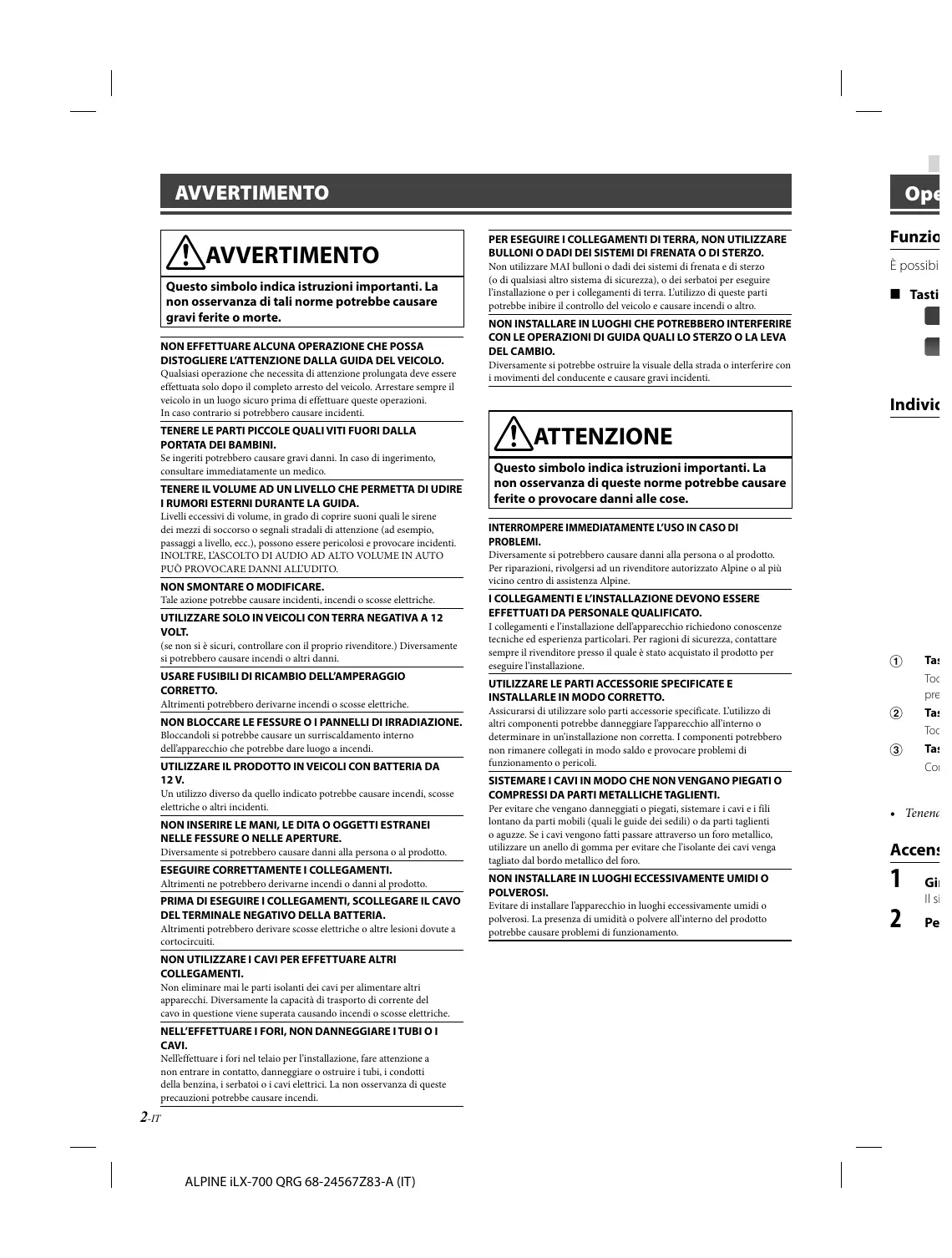 DATA DI INSTALLAZIONE: TECNICO DI INSTALLAZIONE: LUOGO DI ACQUISTO: Per informazioni dettagliate su tutte le funzioni, consultare le Istruzioni per l’uso pubblicate sul nostro sito Web all’indirizzo: http://www.alpine-europe.com. Se necessario, il rivenditore ALPINE fornirà prontamente una copia cartacea delle Istruzioni per l’uso pubblicate sul sito Web. 1-IT ALPINE iLX-700 QRG 68-24567Z83-A (IT) AVVERTIMENTO AVVERTIMENTO Questo simbolo indica istruzioni importanti. La non osservanza di tali norme potrebbe causare gravi ferite o morte.