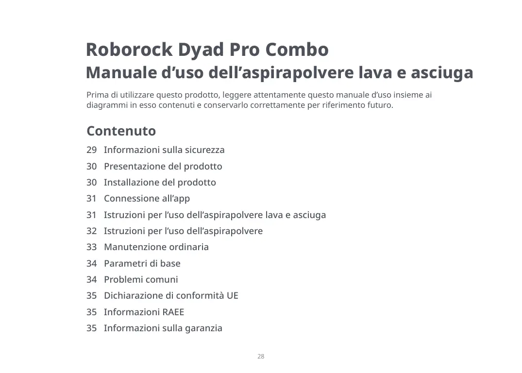 Roborock Dyad Pro Combo Manuale d’uso dell’aspirapolvere lava e asciuga Prima di utilizzare questo prodotto, leggere attentamente questo manuale d’uso insieme ai diagrammi in esso contenuti e conservarlo correttamente per riferimento futuro. Contenuto 29 Informazioni sulla sicurezza 30 Presentazione del prodotto 30 Installazione del prodotto 31 Connessione all’app 31 Istruzioni per l’uso dell’aspirapolvere lava e asciuga 32 Istruzioni per l’uso dell’aspirapolvere 33 Manutenzione ordinaria 34 Parametri di base 34 Problemi comuni 35 Dichiarazione di conformità UE 35 Informazioni RAEE 35 Informazioni sulla garanzia