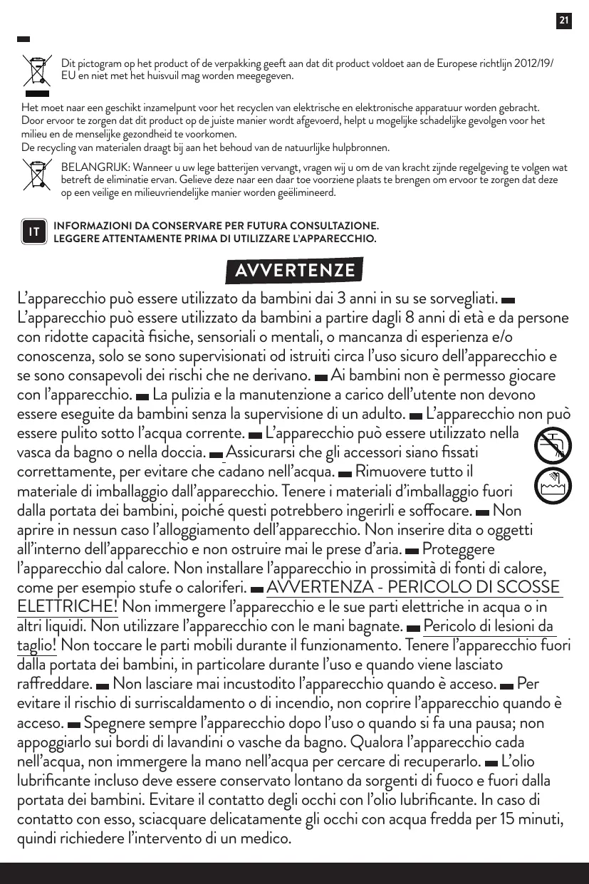 — Une fois la batterie complètement chargée, 100 % et le symbole clignote à l’écran LCD. — Débranchez l’adaptateur de charge de l’appareil et de l’alimentation. Verrouiller le bouton marche/arrêt — Pour éviter d’allumer accidentellement l’appareil, maintenez le bouton marche/arrêt enfoncé pendant environ 2 à 3 secondes pour le verrouiller. Le symbole clignote sur l’écran LCD, puis disparaît. — Maintenez le bouton marche/arrêt enfoncé pendant environ 2 à 3 secondes pour le déverrouiller. — Le bouton marche/arrêt ne peut pas être verrouillé lorsque la batterie est en charge. Couper les cheveux — Éteignez toujours l’appareil lorsque vous fixez, détachez ou changez le sabot. — Sélectionnez le sabot approprié (3 mm/6 mm/9 mm/12 mm) pour la longueur de cheveux souhaitée. Assurez-vous que le sabot est correctement fixé sur la tête de coupe. — Utilisez le peigne de guidage pour faciliter la coupe des cheveux des deux côtés de la tête, en particulier autour des oreilles. — Faites tourner l’anneau de réglage de la longueur de coupe à gauche, puis à droite pour régler la longueur de coupe souhaitée suivant les échelles (0.8 / 1.1 / 1.4 / 1.7 / 2.0). — Appuyez sur les boutons de réglage de vitesse de coupe « + » et « - » pour sélectionner la vitesse de coupe souhaitée. Le réglage sélectionné ( 5000 / 5 500 / 6 000 / 6 500 / 7 000 tr/min) s’affiche à l’écran LCD. — Appuyez sur le bouton marche/arrêt pour allumer l’appareil. — Peignez vos cheveux dans le sens de la pousse. — Posez et appuyez le sabot sur votre tête, commencez par couper les cheveux situés sur les côtés de votre tête, en effectuant un mouvement de bas en haut. Déplacez lentement l’appareil vers le haut de votre tête, en coupant de petites quantités de cheveux. — Faites la même chose sur l’arrière de votre tête. — Coupez les cheveux qui se trouvent sur le dessus de votre tête, depuis l’avant vers l’arrière. — Une fois que vous avez terminé, appuyez sur le bouton marche/arrêt pour éteindre l’appareil. Rafraîchir la nuque et couper les cheveux derrière les oreilles — AVERTISSEMENT N’oubliez pas que les lames de la tête de coupe sont très tranchantes, et qu’elles coupent tous les cheveux qu’elles rencontrent une fois que vous avez retiré le sabot. — Placez l’appareil de sorte qu’un seul bord touche les cheveux. — Tondez doucement les cheveux situés autour des oreilles et rafraîchissez la nuque en plaçant les lames contre le cou en effectuant des mouvements vers le bas. Pour terminer de rafraîchir la nuque, utilisez des ciseaux adaptés (non inclus). — Une fois que vous avez terminé, appuyez sur le bouton marche/arrêt pour éteindre l’appareil. NETTOYAGE — Avant de le nettoyer, éteignez l’appareil et laissez-le refroidir complètement. — Ne nettoyez pas l’appareil et l’adaptateur de charge avec de la laine d’acier, des produits chimiques forts, des produits alcalins, des produits abrasifs ou des produits désinfectants, car ils pourraient endommager leur surface. — N’immergez pas l’appareil et l’adaptateur de charge dans l’eau ou d’autres liquides pour le nettoyer. Assurez-vous que les parties électriques ne sont pas mouillées ou exposées à l’humidité. — Détachez le sabot de la tête de coupe après chaque utilisation. — Retirez tous les cheveux restants sur l’appareil et la tête de coupe. Utilisez la brosse de nettoyage si nécessaire. — Détachez la tête de coupe de l’appareil si nécessaire ; ne plongez pas la tête de coupe dans de l’eau ou d’autres liquides pour la nettoyer. Nettoyez la tête de coupe et l’intérieur de l’appareil avec un chiffon doux et sec. Remettez ensuite la tête de coupe sur l’appareil et assurez-vous qu’elle est bien en place avant de l’utiliser à nouveau. — Huiler régulièrement les lames de la tête de coupe avec une huile de graissage appropriée (fournie). Le symbole clignote à l’écran LCD après 60 minutes de temps total de fonctionnement de l’appareil. — Nettoyez le sabot avec de l’eau propre et séchez-le ensuite. Assurez-vous que le sabot est complètement sec avant de le fixer à la tête de coupe et d’utiliser à nouveau l’appareil. — Nettoyez l’appareil et l’adaptateur de charge avec un chiffon doux et humide et, si nécessaire, un peu de détergent doux. Essuyez avec un chiffon doux et sec. — L’appareil et l’adaptateur de charge ne doivent être réutilisés qu’après séchage complet. ENTREPOSAGE — Avant de ranger l’appareil et l’adaptateur de charge, assurez-vous toujours qu’ils sont complètement secs et refroidis. — Rangez l’appareil et l’adaptateur de charge dans un endroit frais et sec, à l’abri de l’humidité et hors de portée des enfants.