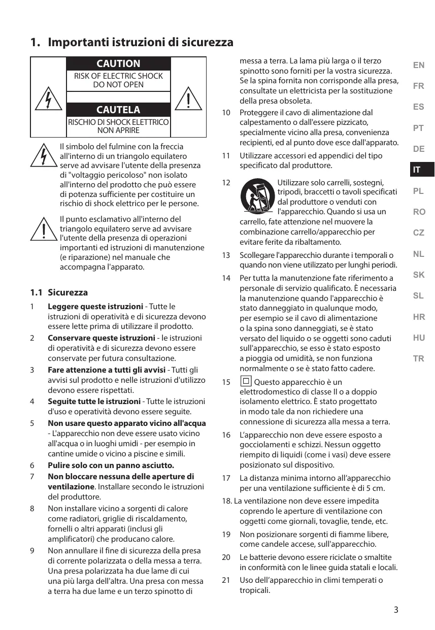 Utilisez uniquement un chariot, socle, trépied, support ou table spécifiés par le fabricant ou vendu avec l’appareil. Lorsqu’un chariot ou rack est utilisé, soyez prudent quand vous déplacez l’ensemble chariot/appareil de manière à éviter les blessures en cas de chute. Débranchez l’appareil en cas d’orage ou lorsqu’il est inutilisé pendant de longues périodes. Confiez toute réparation à un personnel qualifié. Une réparation est nécessaire lorsque l’appareil a été endommagé d’une manière ou d’une autre, tels que lorsque le cordon d’alimentation ou la fiche sont endommagés, du liquide a été renversé, des objets sont tombés à l’intérieur, l’appareil a été exposé à la pluie ou à l’humidité, qu’il ne fonctionne pas correctement ou qu’il est tombé. Cette unité est un appareil électrique à double isolation de Classe II. Il a été conçu de telle sorte qu'il ne nécessite pas une connexion à la terre pour la sécurité électrique. L’appareil ne doit pas être exposé à des égouttements ou des éclaboussures. Aucun objet rempli de liquide, tel qu’un vase, ne doit être placé sur l’appareil. La distance minimale autour de l’appareil pour une ventilation suffisante est de 5 cm. Ne pas entraver la ventilation en recouvrant les ouvertures de ventilation avec des objets tels que journaux, nappes de table, rideaux, etc. Ne pas placer de sources de flammes nues, comme des chandelles, sur le produit. Les piles doivent être recyclées ou mises au rebut conformément aux directives nationales et locales. Utiliser l’appareil dans des climats tempérés ou tropicaux.