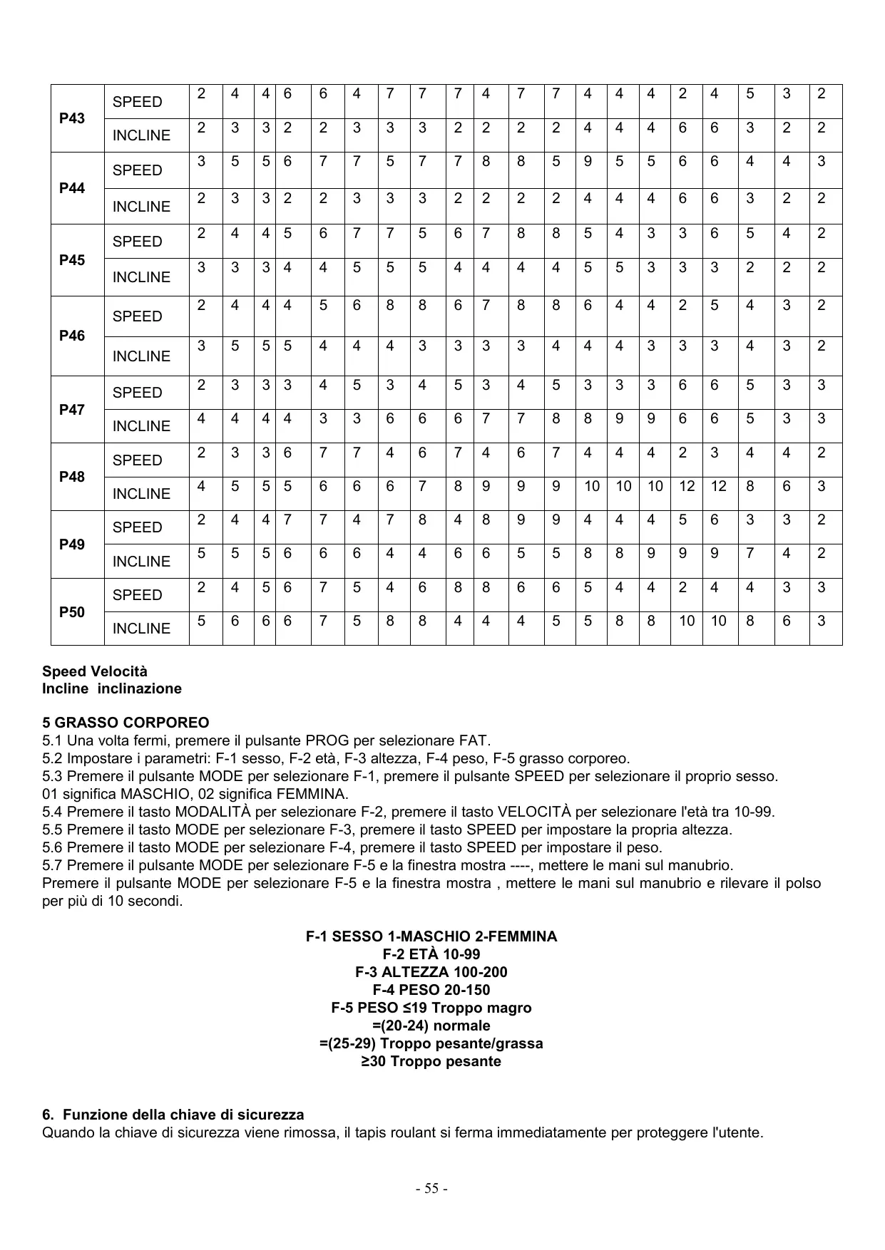 8. Parada de la máquina Puede desconectar la alimentación en cualquier momento para detener la máquina. 9. Calorías Con una inclinación de 0, correr durante 1 km consume 70,3 calorías. 70,3 x Velocidad (km/h) x Tiempo (hora) x (1+ % inclinación) LUBRICACIÓN DE LA CINTA DE CORRER Y LA PLATAFORMA Para prolongar la vida útil de esta cinta de correr, es necesario lubricarla regularmente, lo que constituye un mantenimiento general de la máquina. El procedimiento de mantenimiento rutinario evitará el desgaste prematuro de la cinta de correr y del sistema del motor. El programa de lubricación recomendado es el siguiente LUBRICACIÓN USO 1-6 km/h Cada 6 meses 6-12 km/h Cada 3 meses MANTENIMIENTO Y LUBRICACIÓN Es importante cuidar su cinta de correr (especialmente la superficie de rodadura situada debajo de la cinta). Una buena lubricación con silicona también mejorará el rendimiento de su cinta de correr. ADVERTENCIA: Apague la cinta de correr y retire la llave de seguridad antes de lubricar la superficie de rodadura. - 48 -
