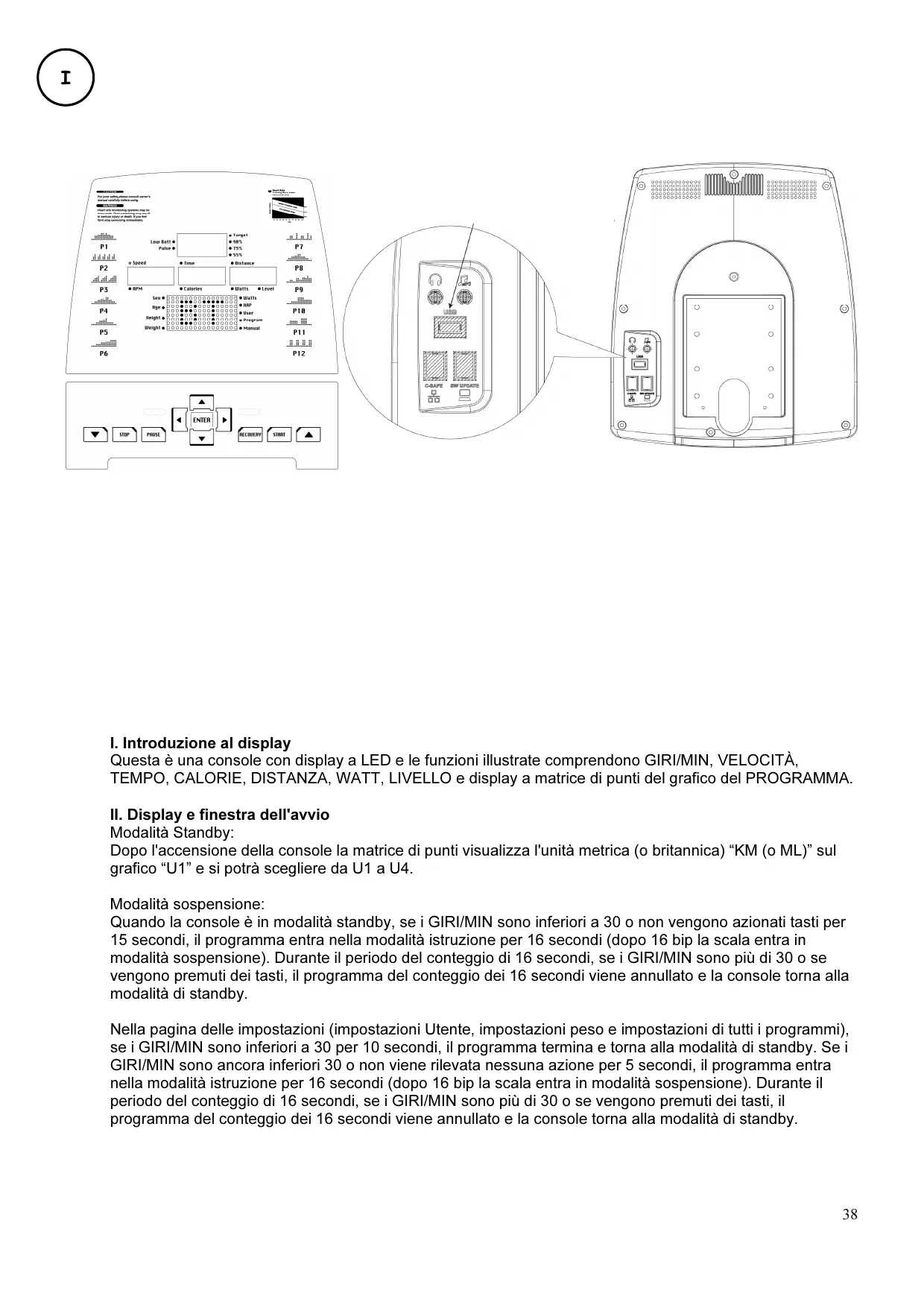 Mode pause : Après l'allumage de la console, la matrice affiche des unités métriques (ou impériales) "KM (ou ML)" sur le graphique "U1", et il est possible de choisir entre U1 à U4. Mode veille : Quand la console est en mode pause, si le RPM est inférieur à 30 ou qu'aucune touche n'est activée pendant 15 secondes, le programme passe en mode de commande pendant 16 secondes (après 16 bips l'échelle entre en mode veille). Pendant la durée de 16 secondes, si le RPM est supérieur à 30 ou que des touches sont activées, le programme de temporisation de 16 secondes est annulé, et la console revient en mode pause. Sur la page de définition (Paramètre utilisateur, paramètre de poids et paramètres dans tous les programmes), si le RPM est inférieur à 30 pendant 10 secondes, le programme s'achève et revient au mode pause. Si le RPM est toujours inférieur à 30 ou qu'aucune activation de touche n'est détectée après 5 secondes, le programme passe en mode de commande pendant 16 secondes (après 16 bips l'échelle entre en mode veille). Pendant la durée de 16 secondes, si le RPM est supérieur à 30 ou que des touches sont activées, le programme de temporisation de 16 secondes est annulé, et la console revient en mode pause. Quand tous les programmes sont utilisés, si le RPM n'a pas atteint 30, l'affichage matriciel indique la chaîne roulante de "RPM↑" pendant 5 secondes. Après cela, si le RPM n'a toujours pas atteint 30, l'affichage matriciel indique la chaîne roulante de "PAUSE" pendant 5 secondes. III. Instructions relatives aux touches 1. DEMARRAGE : Appuyer sur la touche (DEMARRAGE), et le programme lance directement la fonction de DEMARRAGE RAPIDE. 13 Après le début de l'exercice, appuyer sur la touche PAUSE, de telle sorte que le programme lance immédiatement l'action de "pause". Pendant le processus de définition dans PROGRAMME, appuyer sur la touche PAUSE pour revenir à la page sélectionnée du programme pour refaire le travail. 4. ARRET : Appuyer sur la touche ARRET pour arrêter. La touche ENTREE peut être utilisée pour changer l'affichage "VITESSE - TEMPS – DISTANCE / RPM - CALORIES - WATTS". Mode du programme : PROGRAMME P1∼P12 Appuyer sur les touches de direction pour sélectionner PROGRAMME P1∼P12. Appuyer sur Entrée pour afficher la page de définition des valeurs cibles. Après avoir appuyé sur ENTREE, le témoin TEMPS s'allume et le témoin à LED s'illumine sur l'affichage "TEMPS". La valeur initiale de "TEMPS" est "0:00". Appuyer sur les touches de direction pour définir "TEMPS". Après avoir défini "TEMPS", appuyer sur ENTREE. Le témoin DISTANCE s'allume et le témoin à LED s'illumine sur l'affichage "DISTANCE". La valeur initiale de "DISTANCE" est "0,0". Appuyer sur les touches de direction pour définir "DISTANCE". Après avoir défini "DISTANCE", appuyer sur ENTREE. Le témoin CALORIES s'allume et le témoin à LED s'illumine sur l'affichage "CALORIES". La valeur initiale de "CALORIES" est "0". Appuyer sur les touches de direction pour définir "CALORIES". TEMPS – DISTANCE – CALORIES peuvent être définis par cycles. Une fois que les paramètres ciblés de TEMPS, DISTANCE et CALORIES sont déterminés, appuyer sur la touche "DEMARRER". Ce mode commence alors. Pendant l'exercice, La touche ENTREE peut être utilisée pour changer l'affichage "VITESSE - TEMPS – DISTANCE / RPM - CALORIES - WATTS". Pendant l'exercice, appuyer sur "PAUSE", et le programme passe en pause. L'affichage TEMPS / DISTANCE / CALORIES affiche les données de mouvement tour à tour. Après une pause, si vous voulez continuer l'exercice précédent, appuyer sur "DEMARRAGE" et le programme continue d'accumuler les données TEMPS/DISTANCE/CALORIES avant d'appuyer sur pause. Appuyer sur "ARRET" peut arrêter le programme, et appuyer sur "ARRET" de nouveau efface les données de l'exercice et revient à la page principale de sélection du programme pour MANUEL/ PROGRAMME/ UTILISATEUR/ HRC/ WATTS. Messages affichés par l'affichage matriciel pendant l'exercice : Pendant l'exercice, si le RPM n'a pas atteint 30, l'écran affiche deux fois la chaîne roulante de "RPM↑" pendant 5 secondes. Après le message, si le RPM n'a toujours pas atteint 30, le programme passe en pause et l'écran affiche deux fois la chaîne roulante de "PAUSE" pendant 5 secondes. Mode MANUEL Appuyer sur les touches de direction pour sélectionner MANUEL. Appuyer sur Entrée pour afficher la page de définition des valeurs cibles. Après avoir appuyé sur ENTREE, le témoin TEMPS s'allume et le témoin à LED s'illumine sur l'affichage "TEMPS". La valeur initiale de "TEMPS" est "0:00". Appuyer sur les touches de direction pour définir "TEMPS". 14