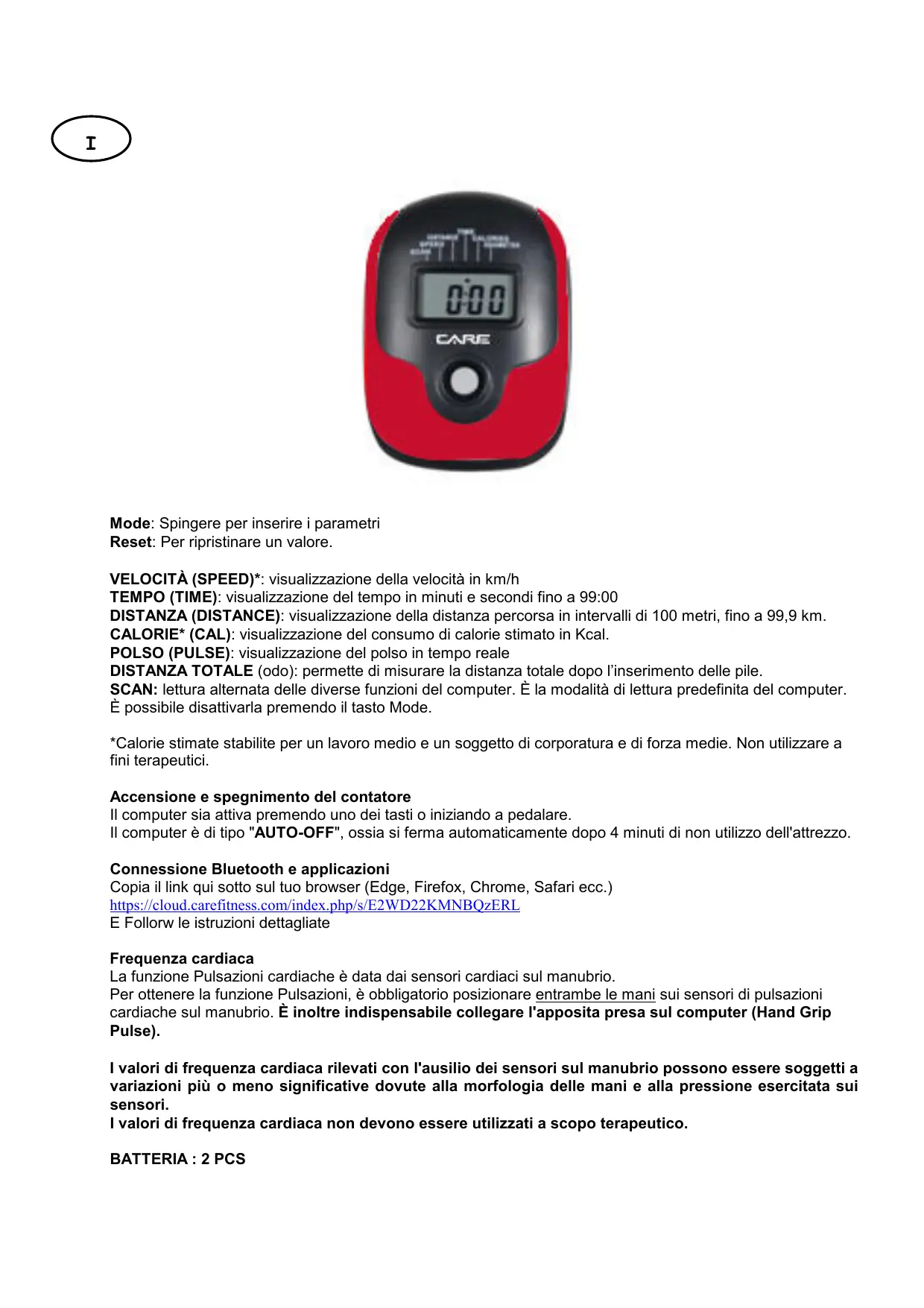 I Mode: Spingere per inserire i parametri Reset: Per ripristinare un valore. VELOCITÀ (SPEED)*: visualizzazione della velocità in km/h TEMPO (TIME): visualizzazione del tempo in minuti e secondi fino a 99:00 DISTANZA (DISTANCE): visualizzazione della distanza percorsa in intervalli di 100 metri, fino a 99,9 km. CALORIE* (CAL): visualizzazione del consumo di calorie stimato in Kcal. POLSO (PULSE): visualizzazione del polso in tempo reale DISTANZA TOTALE (odo): permette di misurare la distanza totale dopo l’inserimento delle pile. SCAN: lettura alternata delle diverse funzioni del computer. È la modalità di lettura predefinita del computer. È possibile disattivarla premendo il tasto Mode. *Calorie stimate stabilite per un lavoro medio e un soggetto di corporatura e di forza medie. Non utilizzare a fini terapeutici. Accensione e spegnimento del contatore Il computer sia attiva premendo uno dei tasti o iniziando a pedalare. Il computer è di tipo "AUTO-OFF", ossia si ferma automaticamente dopo 4 minuti di non utilizzo dell'attrezzo. Connessione Bluetooth e applicazioni Copia il link qui sotto sul tuo browser (Edge, Firefox, Chrome, Safari ecc.) https://cloud.carefitness.com/index.php/s/E2WD22KMNBQzERL E Follorw le istruzioni dettagliate Frequenza cardiaca La funzione Pulsazioni cardiache è data dai sensori cardiaci sul manubrio. Per ottenere la funzione Pulsazioni, è obbligatorio posizionare entrambe le mani sui sensori di pulsazioni cardiache sul manubrio. È inoltre indispensabile collegare l'apposita presa sul computer (Hand Grip Pulse). I valori di frequenza cardiaca rilevati con l'ausilio dei sensori sul manubrio possono essere soggetti a variazioni più o meno significative dovute alla morfologia delle mani e alla pressione esercitata sui sensori. I valori di frequenza cardiaca non devono essere utilizzati a scopo terapeutico.