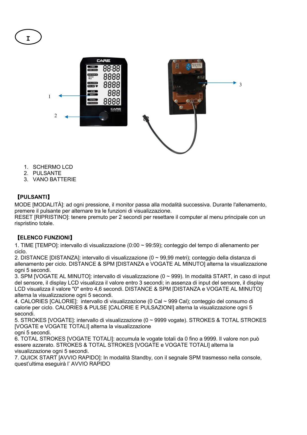 1. SCHERMO LCD 2. PULSANTE 3. VANO BATTERIE 【PULSANTI】 MODE [MODALITÀ]: ad ogni pressione, il monitor passa alla modalità successiva. Durante l'allenamento, premere il pulsante per alternare tra le funzioni di visualizzazione. RESET [RIPRISTINO]: tenere premuto per 2 secondi per resettare il computer al menu principale con un rispristino totale. 【ELENCO FUNZIONI】 1. TIME [TEMPO]: intervallo di visualizzazione (0:00 ~ 99:59); conteggio del tempo di allenamento per ciclo. 2. DISTANCE [DISTANZA]: intervallo di visualizzazione (0 ~ 99,99 metri); conteggio della distanza di allenamento per ciclo. DISTANCE & SPM [DISTANZA e VOGATE AL MINUTO] alterna la visualizzazione ogni 5 secondi. 3. SPM [VOGATE AL MINUTO]: intervallo di visualizzazione (0 ~ 999). In modalità START, in caso di input del sensore, il display LCD visualizza il valore entro 3 secondi; in assenza di input del sensore, il display LCD visualizza il valore "0" entro 4,6 secondi. DISTANCE & SPM [DISTANZA e VOGATE AL MINUTO] alterna la visualizzazione ogni 5 secondi. 4. CALORIES [CALORIE]: intervallo di visualizzazione (0 Cal ~ 999 Cal); conteggio del consumo di calorie per ciclo. CALORIES & PULSE [CALORIE E PULSAZIONI] alterna la visualizzazione ogni 5 secondi. 5. STROKES [VOGATE]: intervallo di visualizzazione (0 ~ 9999 vogate). STROKES & TOTAL STROKES [VOGATE e VOGATE TOTALI] alterna la visualizzazione ogni 5 secondi. 6. TOTAL STROKES [VOGATE TOTALI]: accumula le vogate totali da 0 fino a 9999. Il valore non può essere azzerato. STROKES & TOTAL STROKES [VOGATE e VOGATE TOTALI] alterna la visualizzazione ogni 5 secondi. 7. QUICK START [AVVIO RAPIDO]: In modalità Standby, con il segnale SPM trasmesso nella console,