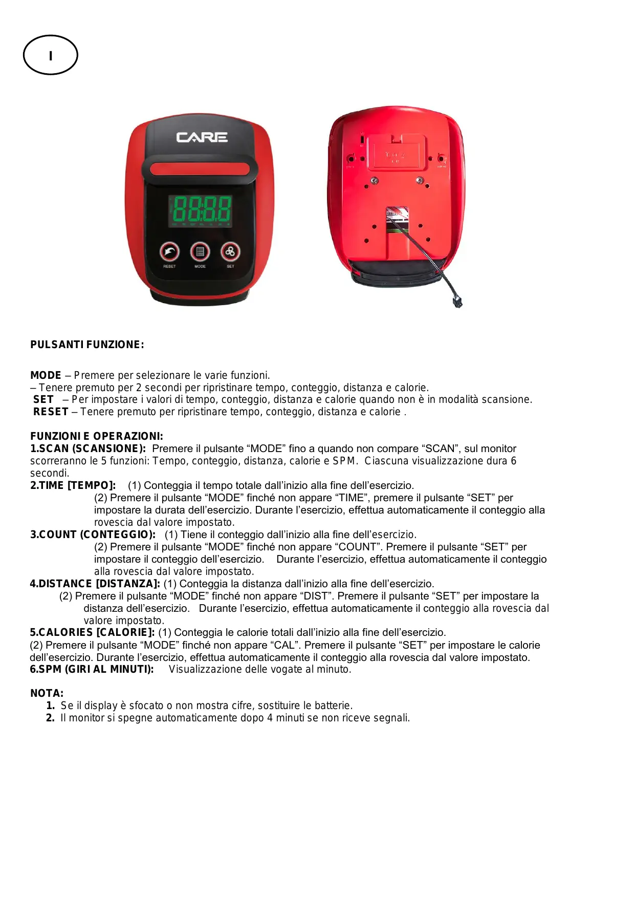 - Maintenez cette touche enfoncée pendant 2 secondes pour réinitialiser l’heure, le comptage, la distance et les calories. SET – Permet de régler les valeurs de temps, de comptage, de distance et de calories en dehors du mode scan. RESET– Permet de réinitialiser l’heure, le comptage, la distance et les calories . FONCTIONNEMENT ET UTILISATION : 1.SCAN : Appuyez sur la touche « MODE » jusqu’à ce que « SCAN » apparaisse, la console fera défiler les cinq fonctions : Temps, comptage, distance, calorie et CR/MIN Chaque affichage durera 6 secondes. 2.TEMPS : (1) Calcule le temps total de l’exercice du début à la fin. (2) Appuyez sur le bouton « MODE » jusqu’à ce que « TEMPS » apparaisse, appuyez sur « PARAMÈTRE » pour déterminer le temps d’exercice. Compte à rebours automatique de l’objectif lors de l’exercice. 3.COMPTAGE : (1) Calcule le comptage de l’exercice du début à la fin. (2) Appuyez sur la touche « MODE » jusqu’à ce que « COUNT » [comptage] apparaisse. Appuyez sur la touche « SET » [réglage] pour déterminer le comptage de l’exercice. Compte à rebours automatique de l’objectif lors de l’exercice. 4.DISTANCE : (1) Calcule la distance de l’exercice du début à la fin. (2) Appuyez sur le bouton « MODE » jusqu’à ce que « DIST » apparaisse. Appuyez sur le bouton « PARAMÈTRE » pour déterminer la distance de l’exercice. Compte à rebours automatique de l’objectif lors de l’exercice. 5.CALORIES : (1) Calcule les calories de l’exercice du début à la fin. (2) Appuyez sur le bouton « MODE » jusqu’à ce que « CAL » apparaisse. Appuyez sur le bouton « PARAMÈTRE » pour définir les calories de l’exercice. Compte à rebours automatique de l’objectif lors de l’exercice. 6.CR/MIN : Affichez les coups de rame par minute. REMARQUE : 1. En cas de luminosité faible ou nulle de l’écran, remplacez les piles. 2. La console s’éteindra automatiquement si aucun signal n’est reçu au bout de 4 minutes.