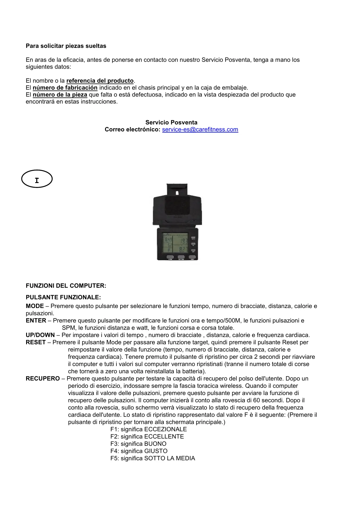 2. Prenez la serviette huilée et essuyez soigneusement toute la longueur de la chaîne d'avant en arrière pour assurer une lubrification complète . 3. Après avoir appliqué l'huile, retirez tout excédent en l'essuyant délicatement. Si nécessaire, répétez le processus jusqu'à ce que la chaîne soit suffisamment lubrifiée. NOTES DE FONCTIONNEMENT TRANSPORT Le rameur est doté d'une paire de roulettes sur le châssis principal. Pour vous déplacer, tenez et inclinez soigneusement le rameur, puis roulez. Rappel: 1. Veuillez utiliser 2 piles de 1,5 V 2. Tenir la console éloignée d’environnements humides Connection application Le nom ou la référence du produit. Le numéro de fabrication indiqué sur le châssis principal et sur le carton d’emballage. Contacter du lundi au vendredi de 10H00 à 12H00 et de 14H00 à 17H00 (sauf jour fériés). Service Après Vente 18 / 22 rue Bernard Z.I. les Vignes 93000 BOBIGNY Tél. : + 33 (0)1 48 43 67 20 https://www.carefitness.com/sav Cuando la computadora muestre el valor del pulso, presione este botón para iniciar la función de recuperación del pulso. La computadora entrará en la cuenta regresiva de 60 segundos. Después de la cuenta regresiva, el estado de recuperación de la frecuencia cardíaca del usuario se mostrará en la pantalla. El estado de recuperación representado por el valor F es el siguiente: (Presione el botón de reinicio para regresar a la pantalla principal).