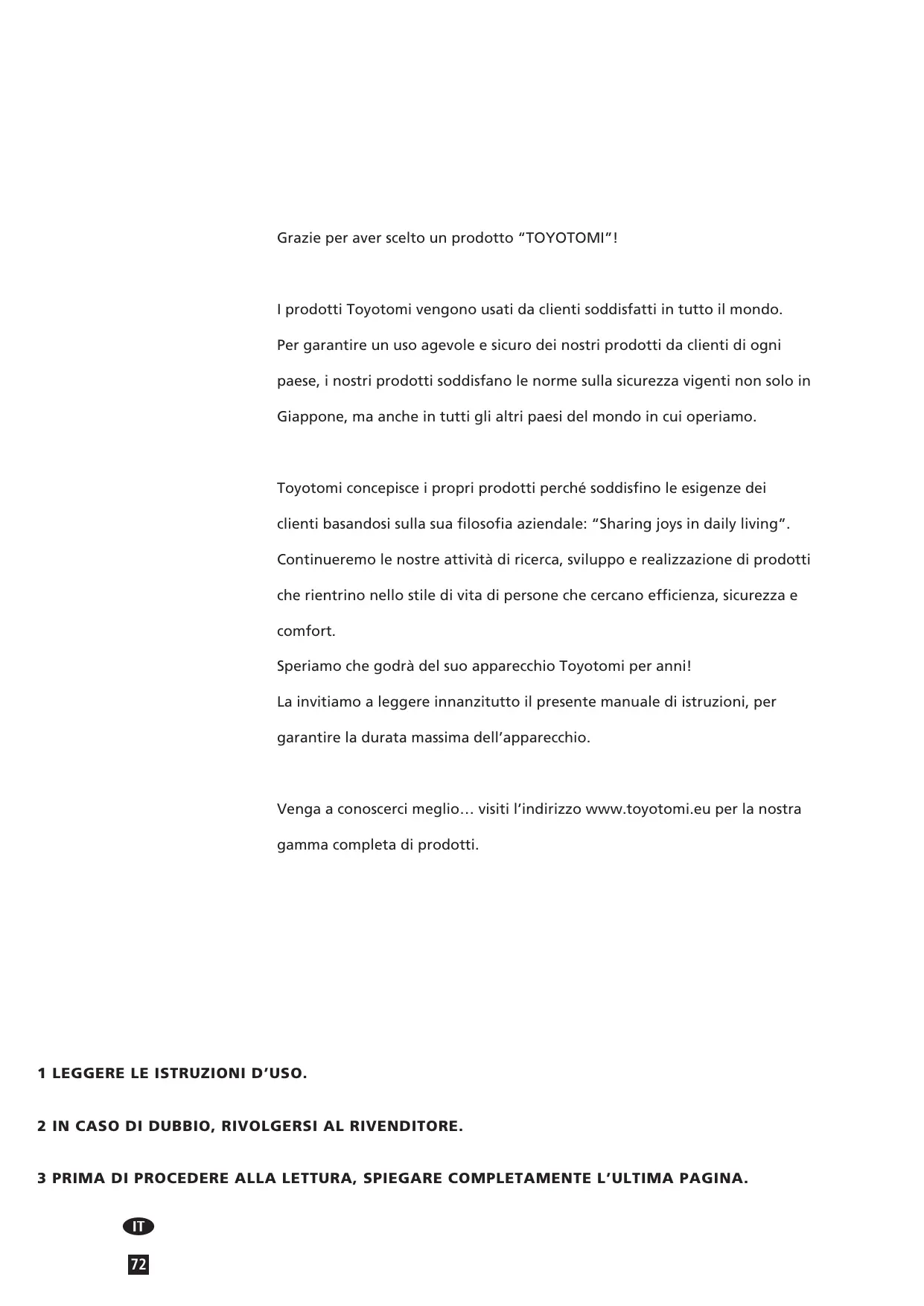 NO guardar el depósito de combustible cerca de la estufa. 4 NO use la estufa en habitaciones polvorientas o en lugares con fuertes corrientes de aire. En ambos casos, no habrá un funcionamiento óptimo. 5 Apague la estufa antes de ir a dormir. 6 Conserve y transporte el combustible únicamente en los depósitos y bidones destinados para ello. 7 No exponga el combustible al calor o a cambios extremos de temperatura. SIEMPRE Guarde el combustible en un lugar oscuro, seco y fresco (la luz solar afecta a la calidad). 8 NUNCA utilice la estufa en lugares donde gases o vapores nocivos puedan estar presentes (por ej., gases de escape o vapores de pintura). 9 La parte superior de la estufa puede calentarse. NO cubra la estufa (hay un riesgo de fuego). Evite cualquier contacto con la parte superior y la rejilla. 10 Asegúrese SIEMPRE de una ventilación suficiente. 11 La estufa no deberá colocarse justo debajo de una toma de corriente. 12 Deberá mantenerse el aparato fuera del alcance de menores de 3 años, a menos que se encuentren bajo supervisión constante. Los niños entre 3 y 8 años de edad solo podrán encender o apagar el aparato siempre y cuando este haya sido colocado o instalado en su posición operativa normal y el menor esté supervisado o haya sido instruido sobre su uso seguro y comprenda los riesgos que entraña. Los menores de 3 a 8 años de edad no deben enchufar, ajustar, limpiar ni realizar tareas de mantenimiento en el aparato. PRECAUCIÓN - Algunas partes de este producto pueden alcanzar temperaturas elevadas y causar quemaduras. Se debe prestar especial atención cuando haya menores y personas vulnerables. 13 Los niños no deben utilizar el aparato como un juguete. 14 Las tareas de limpieza y mantenimiento reservadas al usuario no deben ser realizadas por niños sin supervisión. 15 NO permanezca cerca de la estufa durante mucho tiempo. Nous espérons que vous apprécierez votre appareil “Toyotomi” pour les années à venir! Pour assurer une durée de vie maximale pour cet appareil, nous vous invitons d’abord à lire ce manuel d’instruction. Apprenez à mieux nous connaître ... rendez-vous sur notre site www.toyotomi.eu pour une vue d’ ensemble de notre gamme de produits.