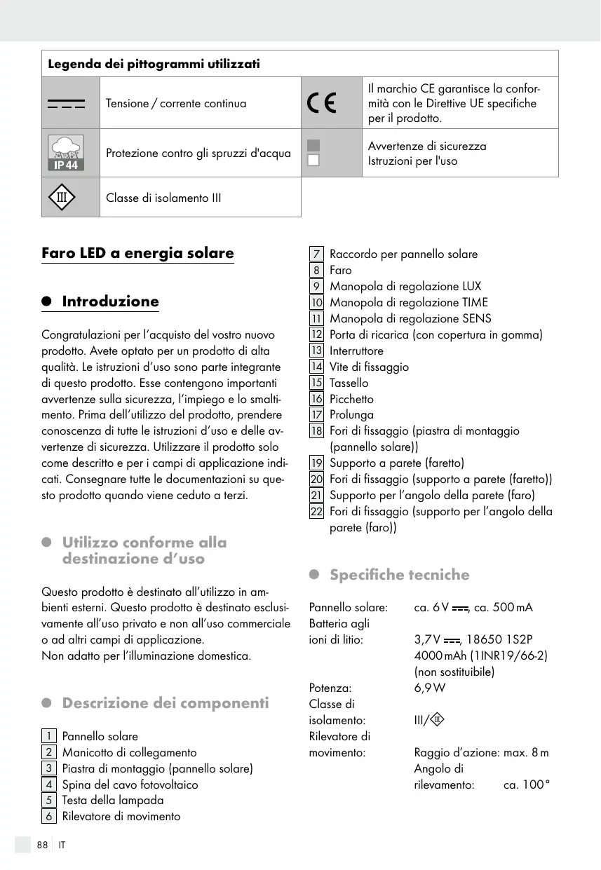 Classe di isolamento III Faro LED a energia solare Introduzione Congratulazioni per l‘acquisto del vostro nuovo prodotto. Avete optato per un prodotto di alta qualità. Le istruzioni d‘uso sono parte integrante di questo prodotto. Esse contengono importanti avvertenze sulla sicurezza, l‘impiego e lo smaltimento. Prima dell‘utilizzo del prodotto, prendere conoscenza di tutte le istruzioni d‘uso e delle avvertenze di sicurezza. Utilizzare il prodotto solo come descritto e per i campi di applicazione indicati. Consegnare tutte le documentazioni su questo prodotto quando viene ceduto a terzi.