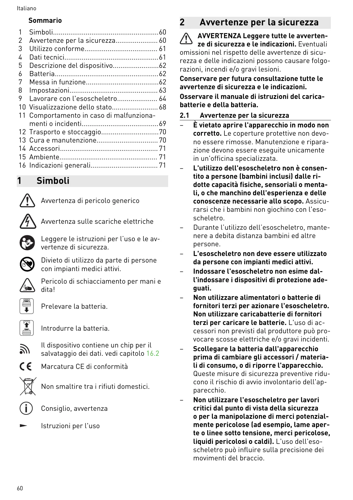 EN 301 489-17 V3.2.4 BS EN 62233:2008 BS EN 62479:2010 BS EN IEC 62368-1:2020 + A11:2020 BS EN IEC 63000:2018 The conformity assessment procedure as referenced in Article 17 and detailed in Annex III of the Radio Equipment Regulation S.I. 2017/1206 has been followed with the involvement of Notified EN 62479:2010, EN IEC 62368-1:2020 + A11:2020, EN IEC 63000:2018 Das Konformitätsbewertungsverfahren, auf das in Artikel 17 verwiesen und im Anhang III der Funkanlagenrichtlinie 2014/53/EU detailliert wird, wurde unter Einbeziehung der benannten Stelle durchgeführt: Entretien et maintenance 44 Accessoires 45 Environnement 45 Remarques générales45 Respecter la notice d'utilisation du chargeur et de la batterie. 2.1 Consignes de sécurité – Toute ouverture inappropriée de l'appa reil est interdite. Le retrait des protections est interdit. L'entretien et les réparations doivent uniquement être confiés à un ate lier de service après-vente agréé. – L'exosquelette ne doit pas être utilisé par des personnes (y compris des enfants) aux capacités physiques, sensorielles ou men tales diminuées ou ne disposant pas de suffisamment d'expérience et de connais sances. Veillez à ce qu'il ne soit pas pos sible à des enfants de jouer avec l'exosque lette. – Tenez les enfants et autres personnes à l'écart pendant l'utilisation de l'exosquelet te. – L'exosquelette ne doit pas être utilisé par des personnes portant des implants médi caux actifs. – Le port de l'exosquelette ne dispense pas du port d'un équipement de protection ap proprié. – Ne faites pas fonctionner l'exosquelette avec des blocs d'alimentation ou avec des batteries d'autres fabricants. N'utili sez pas de chargeurs d'autres fabricants pour recharger les batteries. L'utilisation d'accessoires autres que ceux prévus par le fabricant peut provoquer une décharge électrique et/ou des accidents graves. – Retirez toujours la batterie de l'appareil avant de le stocker ou de remplacer des accessoires/consommables. Les mesures de sécurité préventives de ce type rédui sent le risque de démarrage accidentel de l'appareil. – N'utilisez pas l'exosquelette pour réaliser des opérations critiques en termes de sé curité ou pour manipuler des objets po tentiellement dangereux (par ex. des la