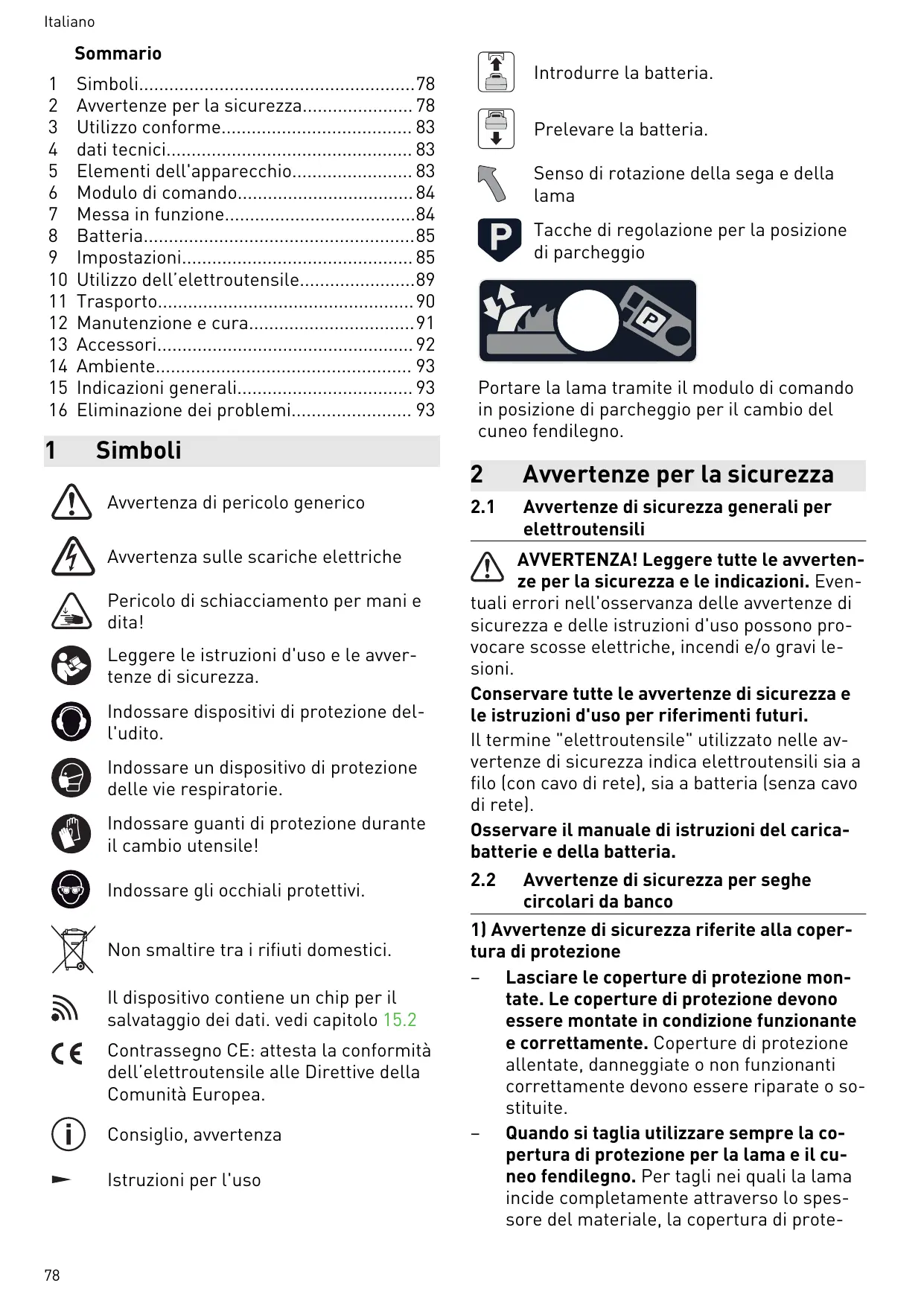 Rimuovere il cappuccio [25-3] e svitare ► leggermente la vite sottostante. ► Regolare il taglio libero con la vi te [25-4]. NOTA : NON spostare la vi te [25-5]. Altrimenti il carrello scorrevole non ha più un movimento fluido. + Serrare le viti. ► Ler Manual de instruções, indicações de segurança! Usar proteção auditiva! Usar máscara de proteção! Usar luvas de proteção durante a mu dança da ferramenta! Usar óculos de proteção! Não deitar no lixo doméstico. A ferramenta contém um chip para guardar dados. Consultar capítulo 15.2 2.7 Valores de emissões Os valores determinados de acordo com EN 62841 são tipicamente: