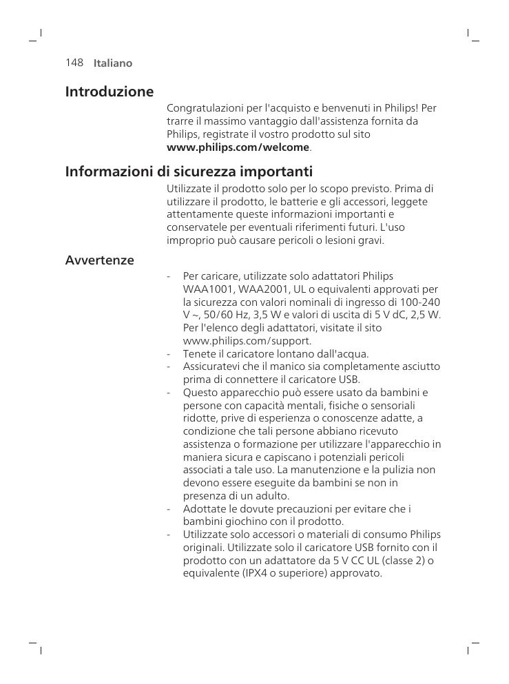 -_ Utilizzate solo accessori o materiali di consumo Philips original. Utilizzate solo il caricatore USB fornito con il prodotto con un adattatore da 5 V CC UL (classe 2) o equivalente (IPX4 o superiore) approvato.