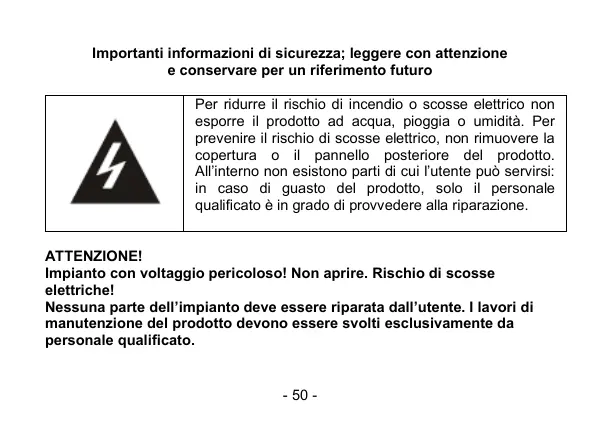 Per ridurre il nischio di incendio o scosse eletirico non esporre il prodotto ad acqua, pioggia o umidità. Per prevenire il rischio di scosse elettrico, non rimuovere la copertura o il pannello posteriore del prodotto. Allinterno non esistono parti di cui l'utente pud servirsi: in caso di guasto del prodotto, solo il personale qualiicato à in grado di prowvedere alla riparazione.