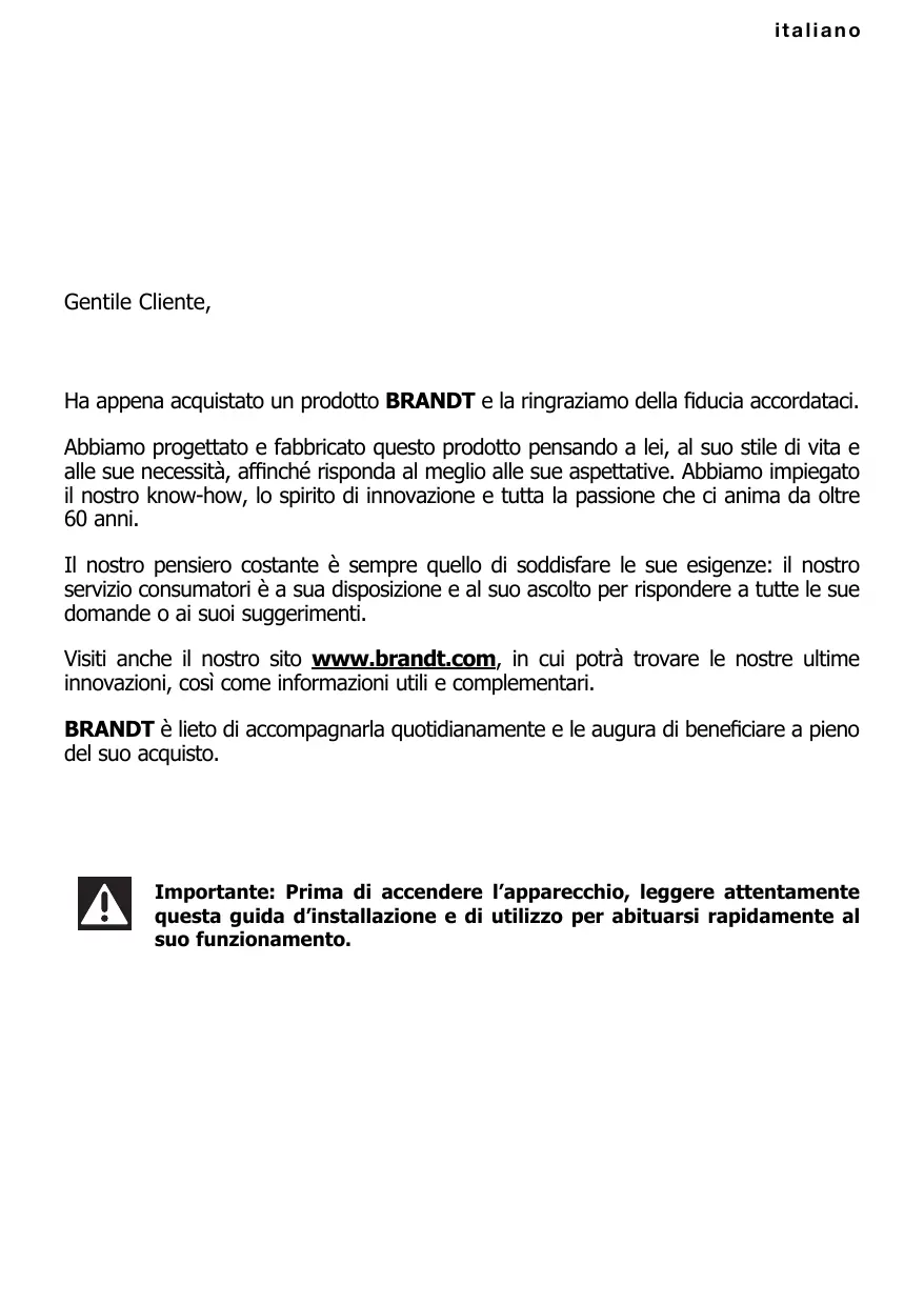 italiano Gentile Cliente, Ha appena acquistato un prodotto BRANDT e la ringraziamo della fiducia accordataci. Abbiamo progettato e fabbricato questo prodotto pensando à lei, al suo stile di vita e alle sue necessità, affinché risponda al meglio alle sue aspettative. Abbiamo impiegato il nostro know-how, lo spirito di innovazione e tutta la passione che ci anima da oltre 60 anni. Il nostro pensiero costante à sempre quello di soddisfare le sue esigenze: il nostro servizio consumatori à a sua disposizione e al suo ascolto per rispondere a tutte le sue domande o ai suoi suggerimenti. Visiti anche il nostro sito www.brandt.com, in cui potrà trovare le nostre ultime innovazioni, cosi come informazioni utili e complementari. BRANDT à lieto di accompagnarla quotidianamente e le augura di beneficiare a pieno del suo acquisto. importante: Prima di accendere l'apparecchio, leggere attentamente questa guida d'installazione e di utilizzo per abituarsi rapidamente al suo funzionamento.